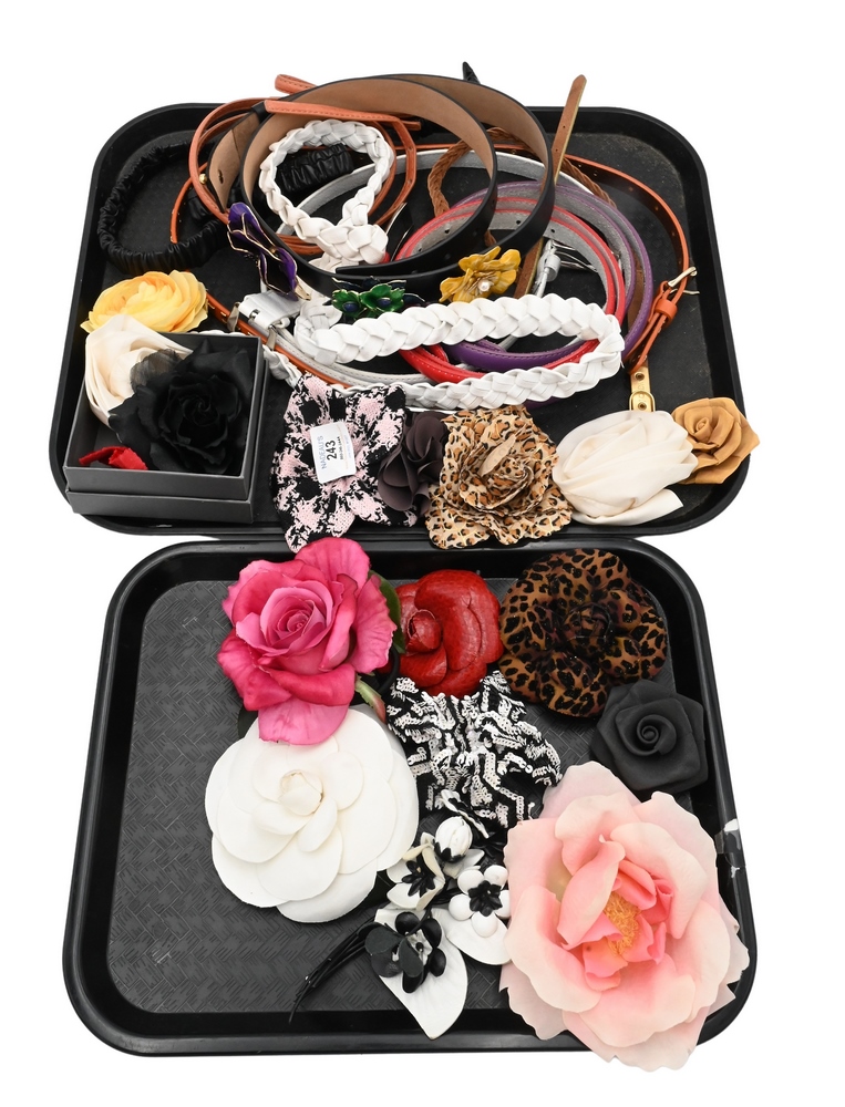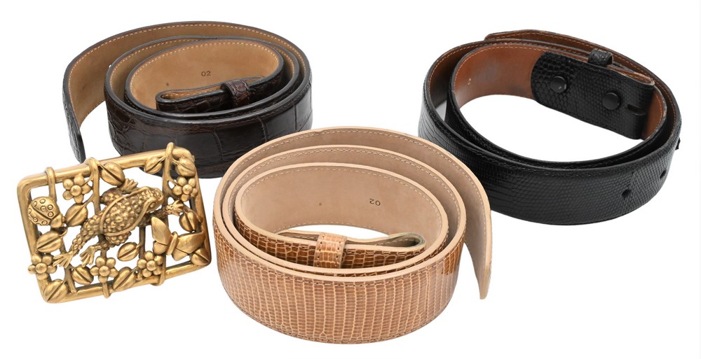 Four Piece Kieselstein-Cord New York Couture Lot, to include three size 2 leather belts, one marked “Genuine American Alligator”, two marked “Genuine Lizard”; along with bronze rain forest belt buckle; two belts and buckle with original dust covers.
