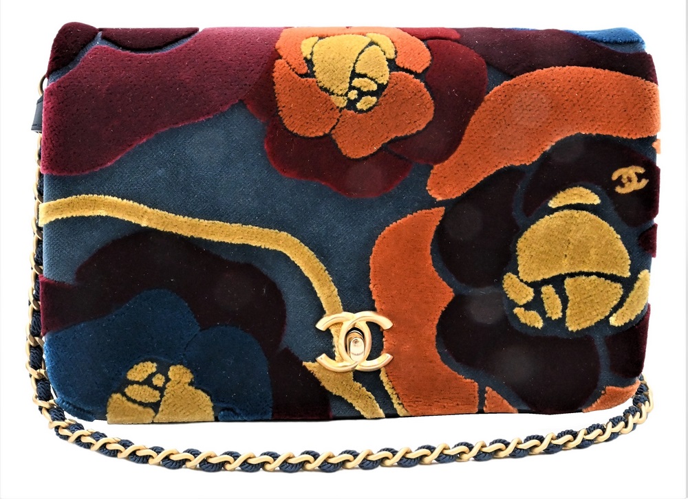 Chanel Velour Brode Flap Bag, navy base with velvet velour flowers, maroon leather interior, original box, receipt and care instruction booklet included, ID #24578912.