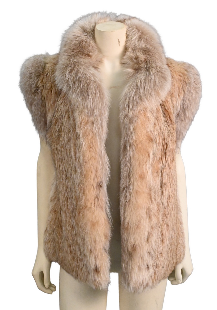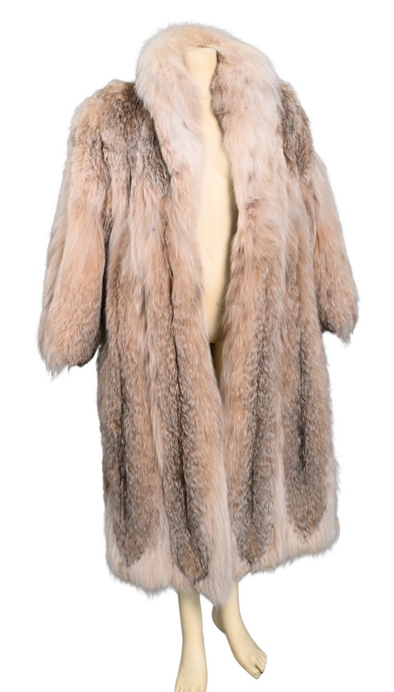 Natural Full Length Lynx Coat, vertically cut, fully let out, shawl collar, straight sleeves, West Hartford, CT tag, like new condition, original purchase price $11,500, shoulder to shoulder 17 inches, total length 54 inches.