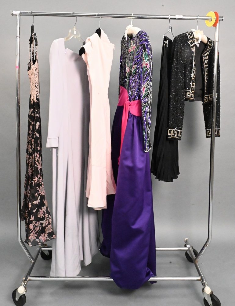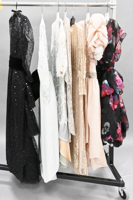 Seven Piece Women’s Vintage Couture Lot, to include a Megere sequin dress, size small; two Rina Di Montella lace dresses, size 8; Richillene custom gown; John Anthony custom gown; Carol Pertz lace dress; along with an Anthony Muto for Moroci dress.