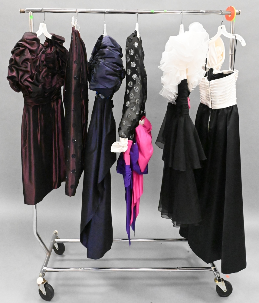 Six Vintage Women’s Dresses/Gowns, to include a Eugene Alexander dress, size 10; a Diane Dickinson dress, size 10; two dresses having sequins, both size 12; a skirt, along with a black and white dress bearing a Rose Taft for Couture Fashions label.