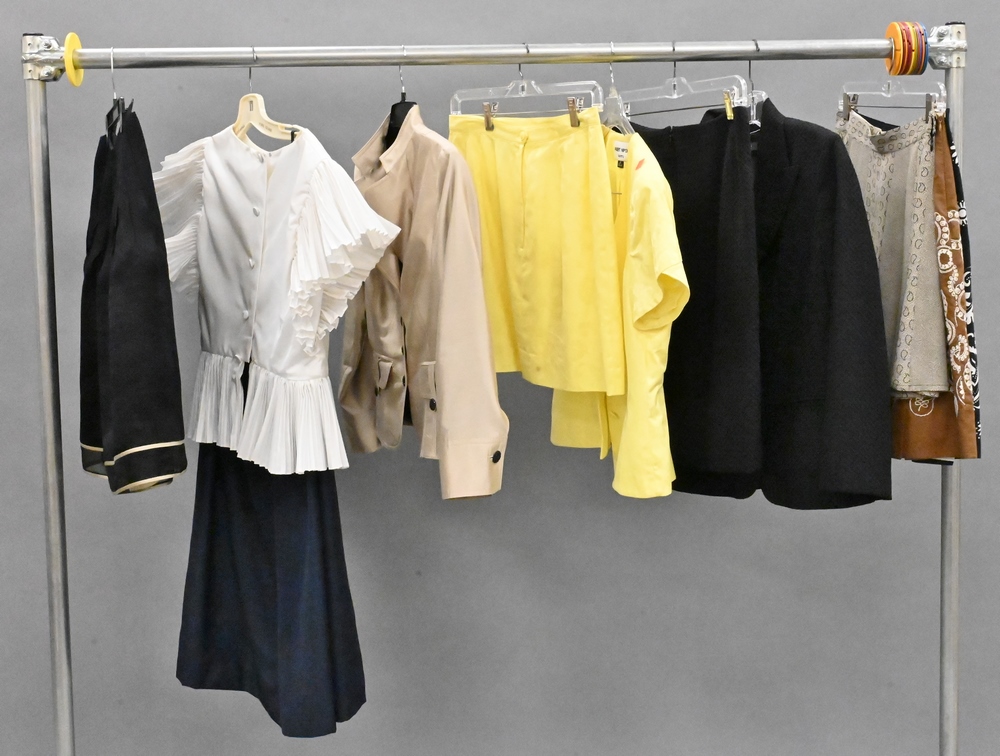 11 Piece Vintage Couture Lot, to include a two-piece Albert Nipon skirt and blazer, size 8; a two-piece Anne Klein skirt and blazer, size 12; a two-piece Kay Unger New York women’s suit, size 8; a two-piece Morton Myles women’s suit, size 8; along with 3 skirts by Acorn, Tribal & Delilah.