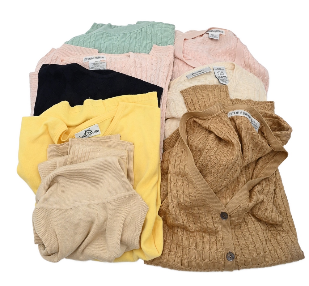 Table Group of Clothing, to include sweaters, shires, mostly size small/medium, Joan Vass, Polatof, Malo Cos, Ballantyne, Chicos, Zara Knit, Ann Taylor, Ralph Lauren, Merino wool, along with Brooks Brothers.