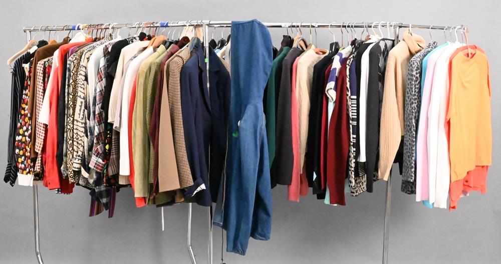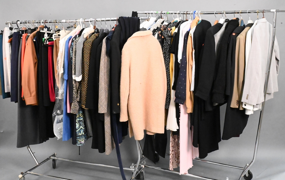 Two Racks of Vintage Women’s Clothing, to include skirts, blazers, jackets, blouses, and dresses from Sonja Bogner, Sammermann, Bergdorf Goodman, Calvin Klein, Madewell, Etro, Beretta, J. Crew, Kenzo, etc.