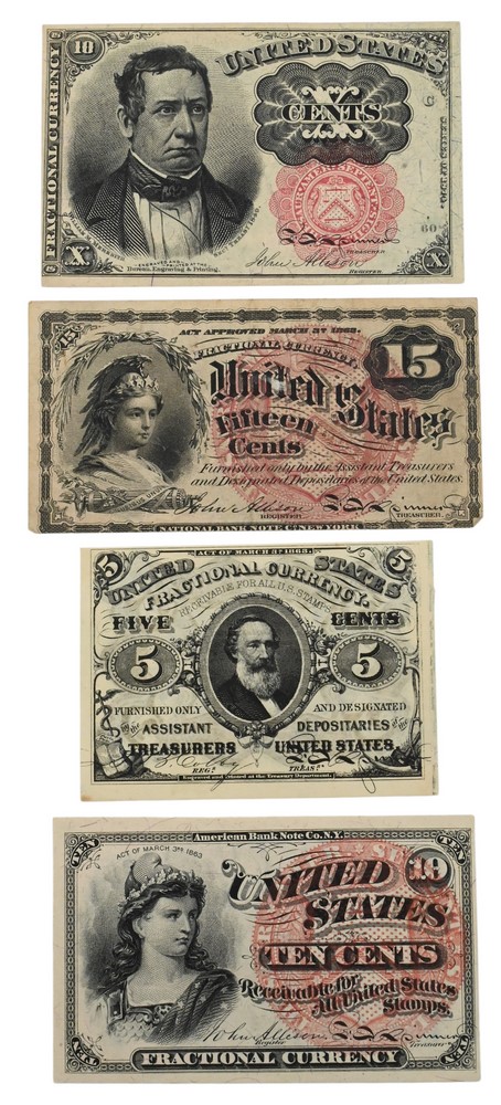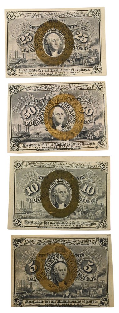 Set of 4 Washington Fractional Currency, to include paper bank notes, receivable for all United States stamps 1863, 5 cent, 10 cent, 25 cent, 50 cent, in excellent condition.