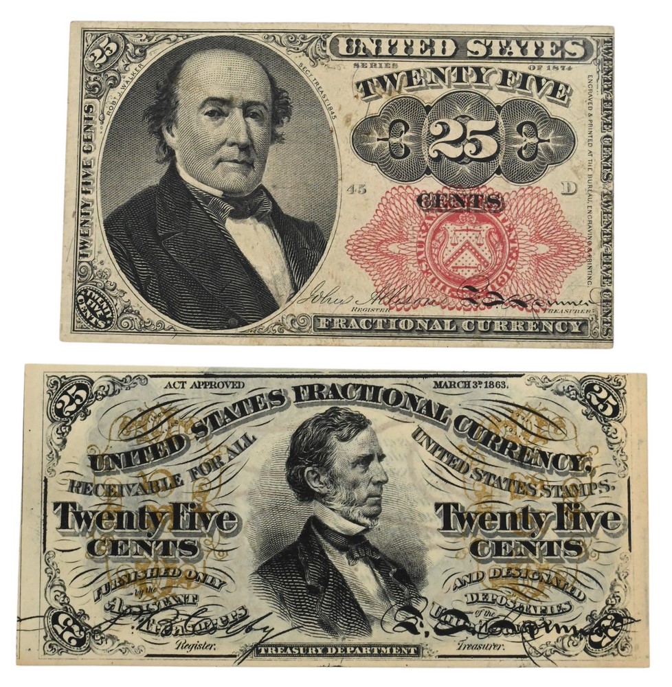 Group of Four Small Bank Notes, to include two 25 cent fractional currency 1863 bank notes; one 50 cent fractional currency 1875 bank note along with one 50 cent Mississippi 1864 note.