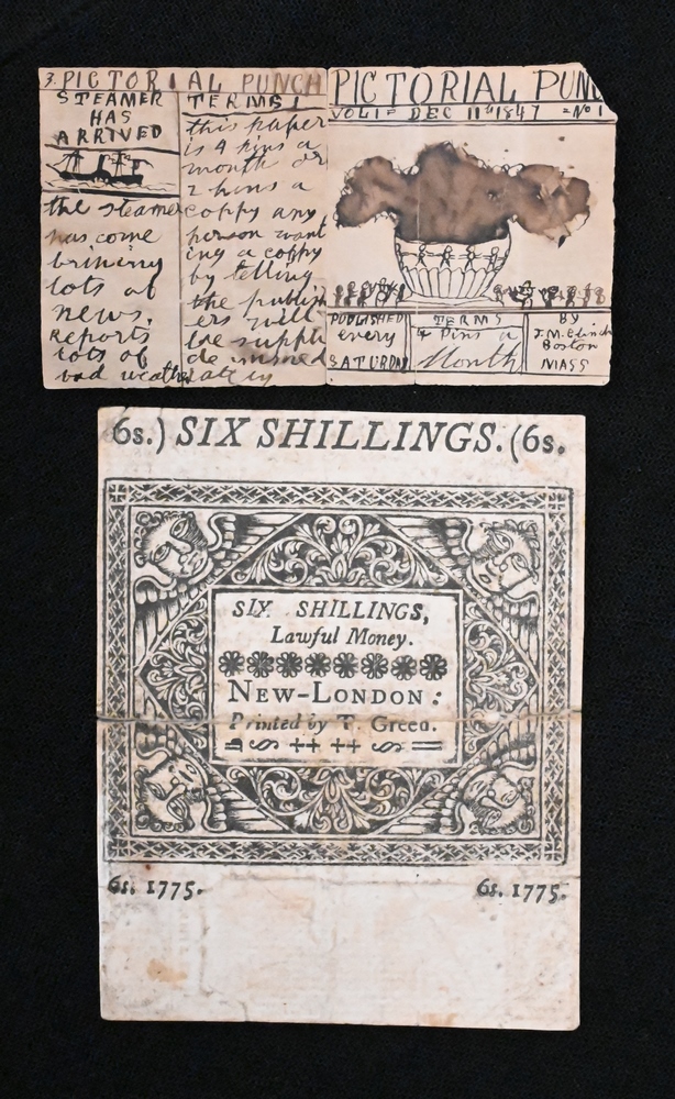 Two Piece Group, to include an 1847 Pictorial Punch hand written and drawn card having pictures with story line or poem to go along with it, each segment titled Pictorial Punch, 2 x 3 1/4, along with 1775 Colonial Currency for New London, Connecticut, six shillings printed by T. Green, 3 1/2 x 3.