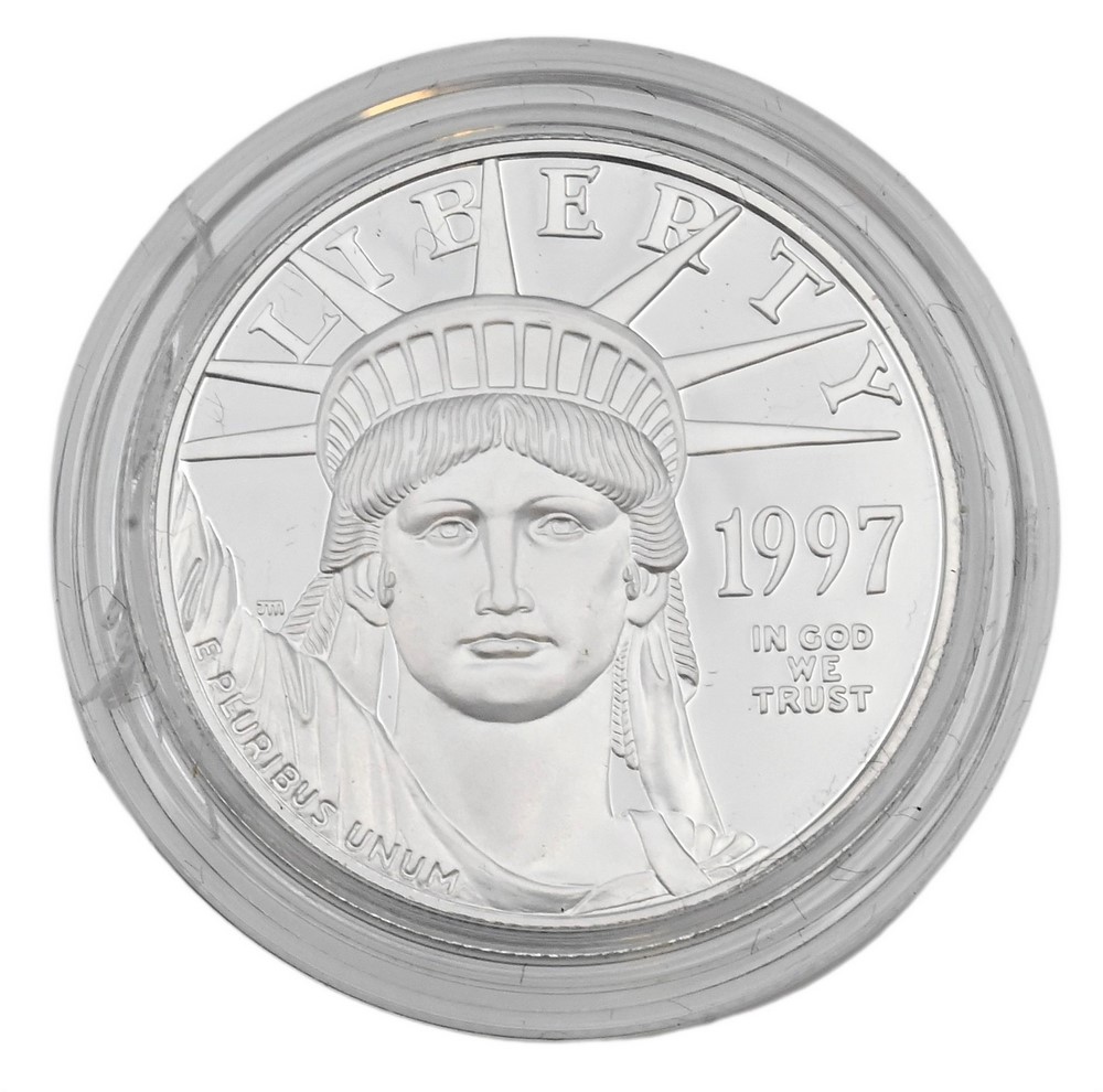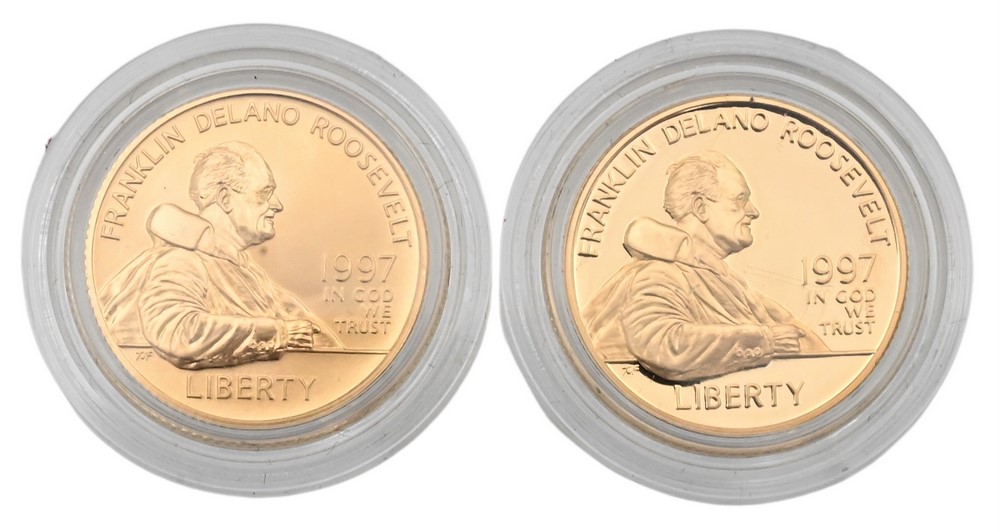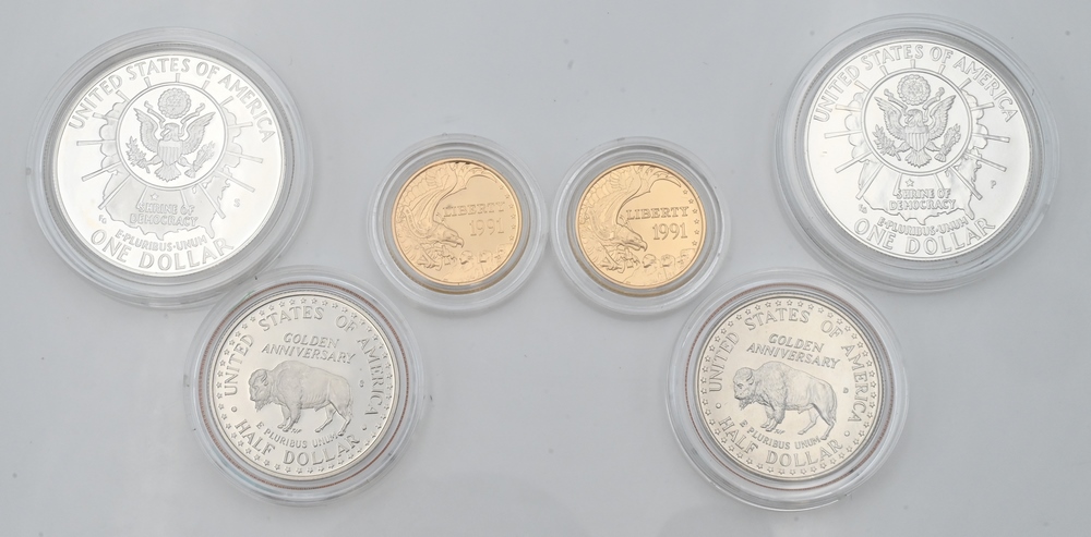 Six Piece Coin Lot, to include two proof 5 dollar gold coins, along with six 1991 Mount Rushmore coins, to include three uncirculated, one proof copper/nickel, and one proof silver dollar.
