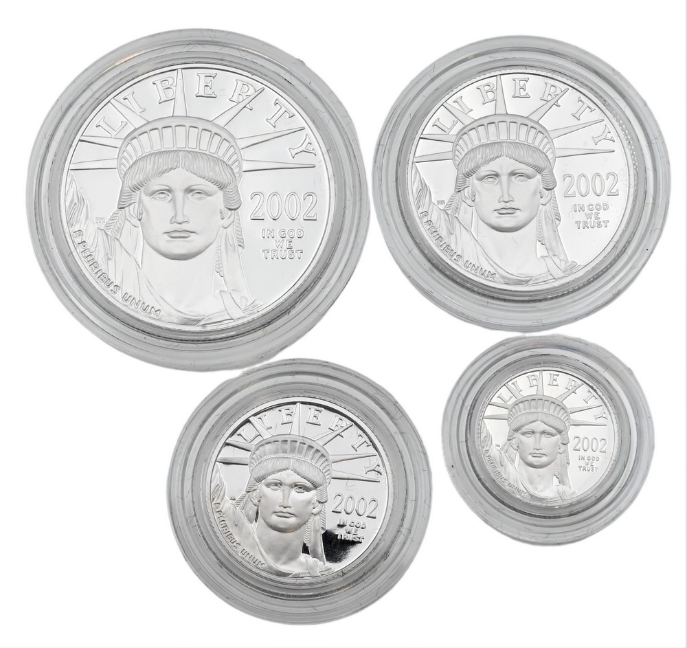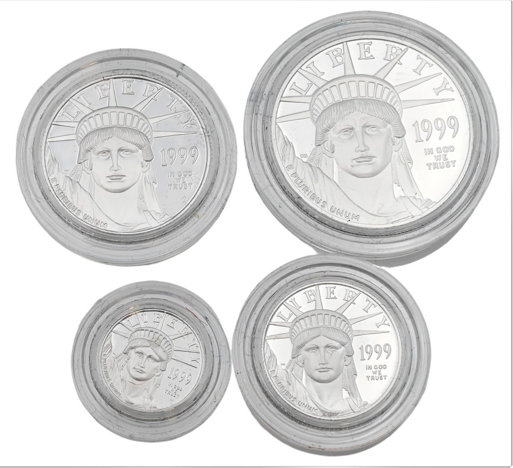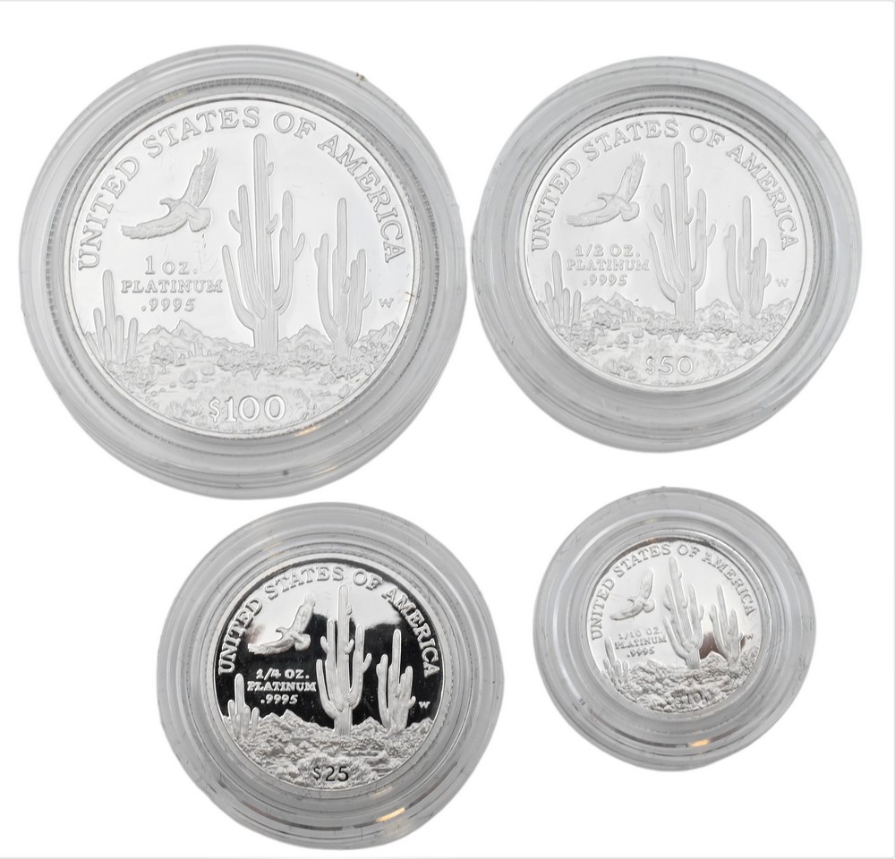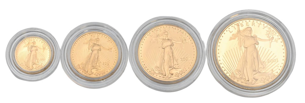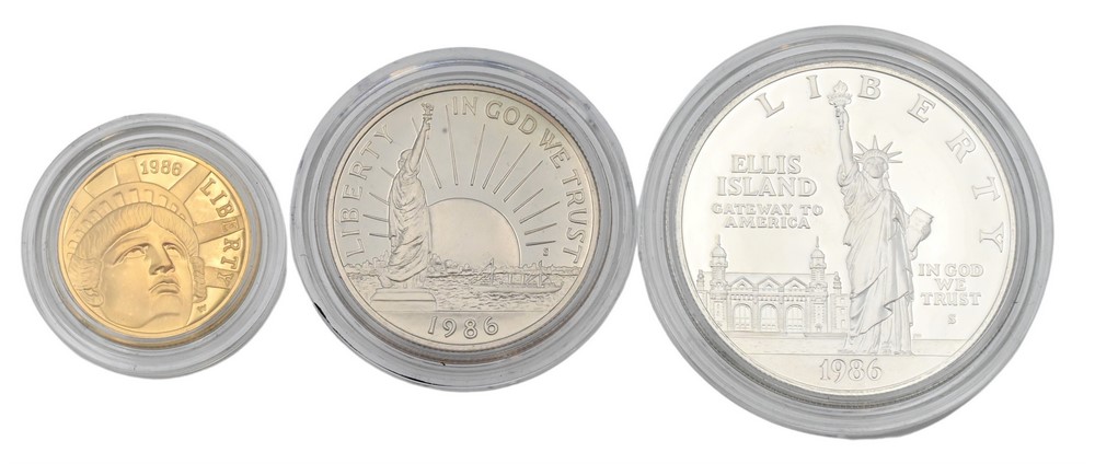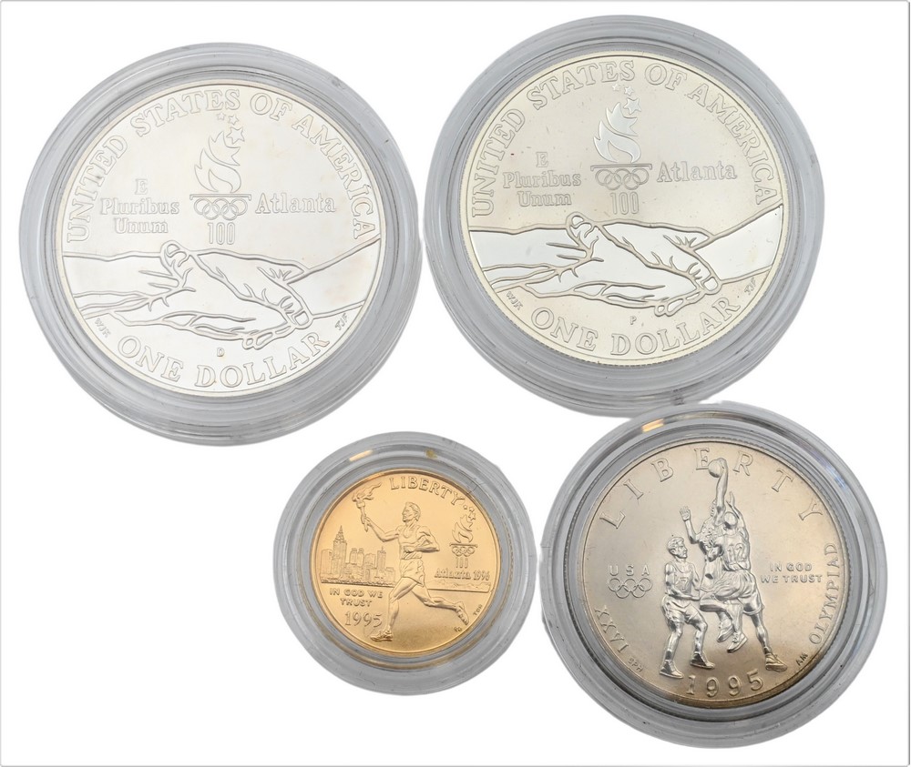 Four Piece Coin Lot, to include one uncirculated 5 dollar gold, a 1995 Atlanta Olympics one C-N half-dollar, one uncirculated silver dollar, along with one proof silver dollar.