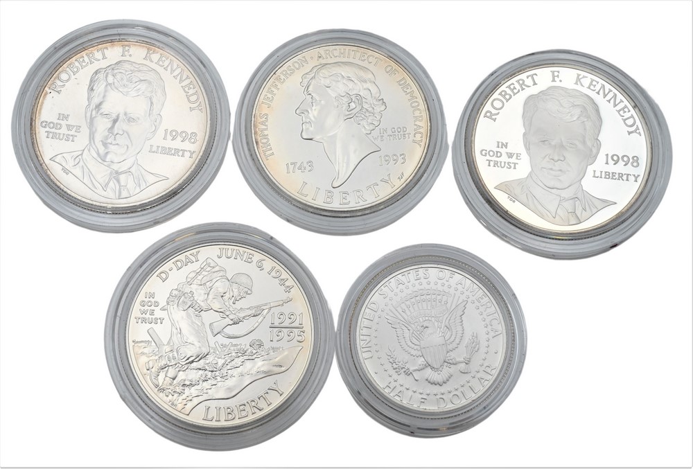 Five Piece Lot, to include two RFK silver dollars, one uncirculated, one proof; one JFK 1992 1/2 dollar with special finish; a silver World War II uncirculated dollar; along with Thomas Jefferson uncirculated dollar.