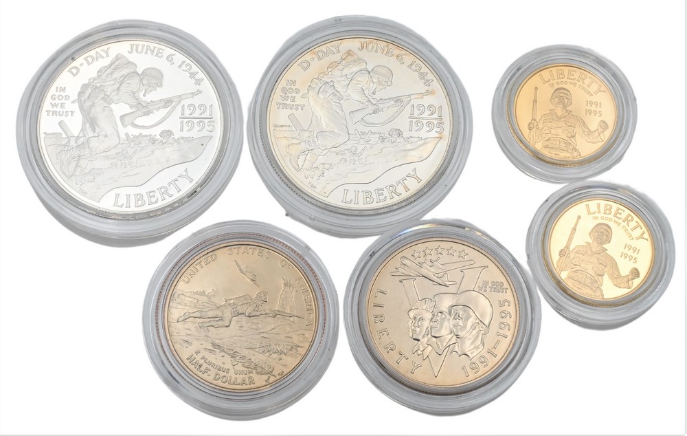 Six 1993 Korean War Coins, to include two copper/nickel half dollars, two silver one dollars, along with two 5 dollar gold (one uncirculated, one proof).