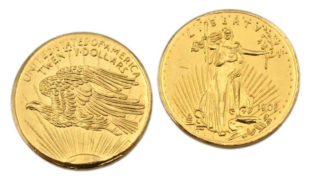 Two miniature replicas of 1908 Saint Gaudens Twenty Dollar Gold Pieces, marked United States of America Twenty Dollars Liberty 1908, 1.6 grams total weight.
