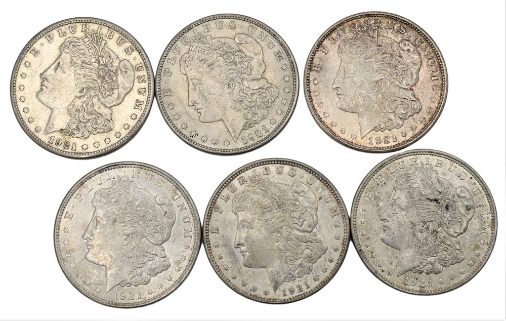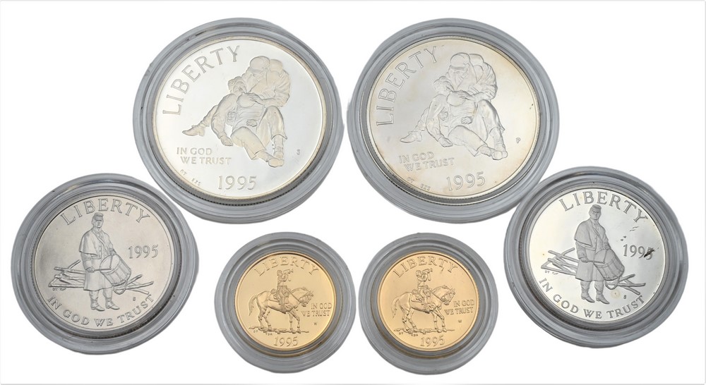 Six Piece Coin Lot, to include two 5 dollar gold, along with four 1994 coins Soccer, 1 three piece uncirculated set, 1 three piece proof set, 2 silver dollars, and C-N half -dollars.