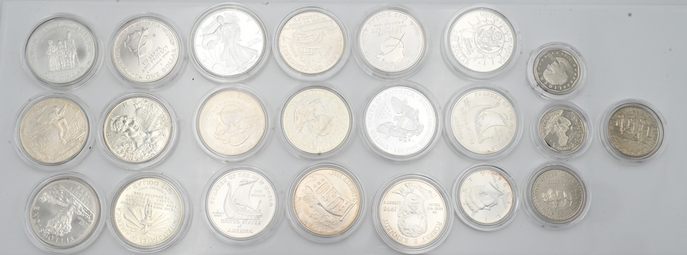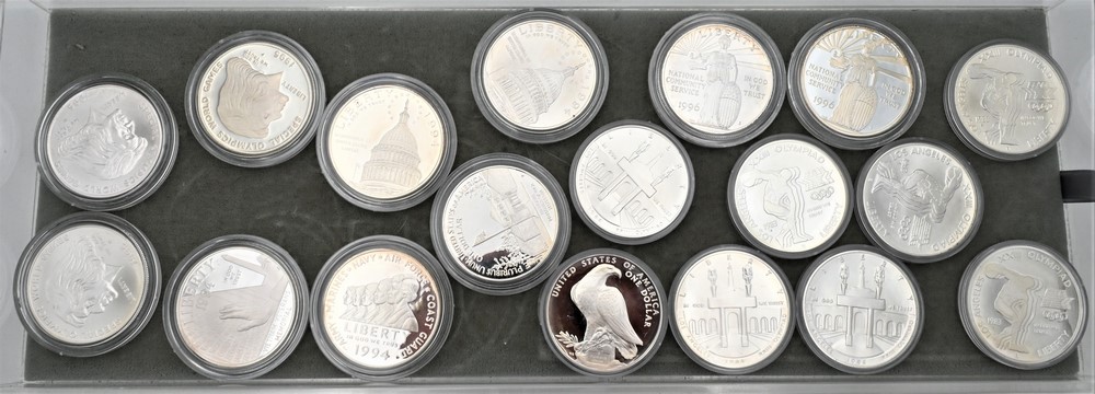 Lot of 18 Coins, to include 8 Olympic coins, 1983 P-D-S uncirculated dollars, 1986 P-D-S uncirculated dollars; 1983-S proof; 1984-S proof; 5 1994 silver dollars, (1 uncirculated and 4 proofs), Women in Military Service, National POW, Vietnam Veterans Memorial, Capital, 1 uncirculated and 1 proof; 1995 Special Olympics World Games 3 piece set to include silver dollars, 2 uncirculated, 1 proof; along with 2 1996 Community Service uncirculated silver dollars, and 1 dollar silver proof.
