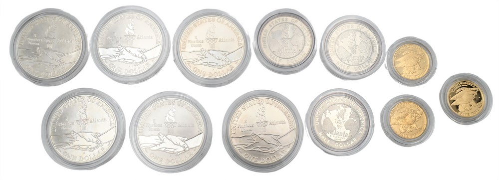 Twelve Piece Coin Lot, to include two proof 5 dollar gold, and one uncirculated 5 dollar gold, along with 1995 Olympics Atlanta pieces to include two half-dollar copper nickel proofs, one half-dollar copper/nickel uncirculated, three uncirculated silver dollars, and three proof silver dollars.