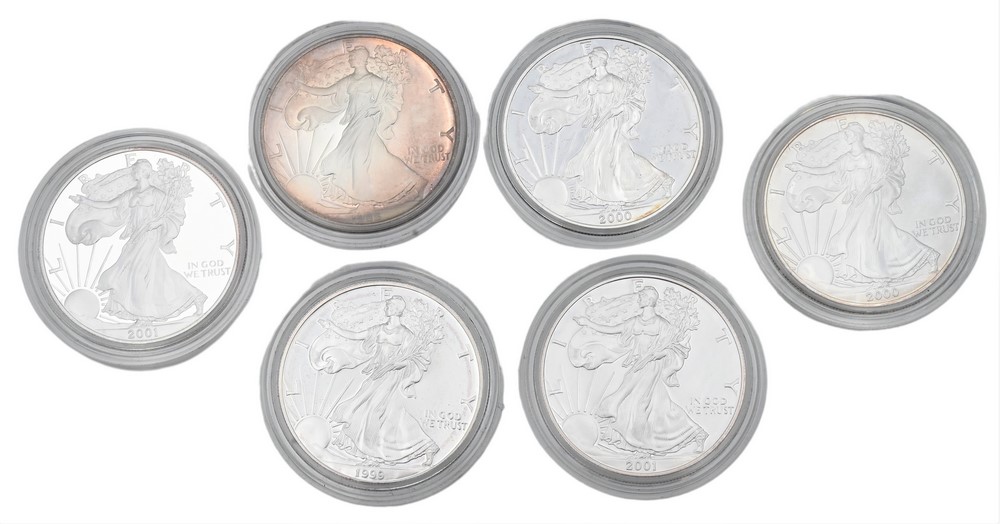 Six Silver Eagles, to include 1999 one dollar American Eagle proofs, 2000 one dollar proofs American silver Eagle, along with one dollar uncirculated American silver Eagle.