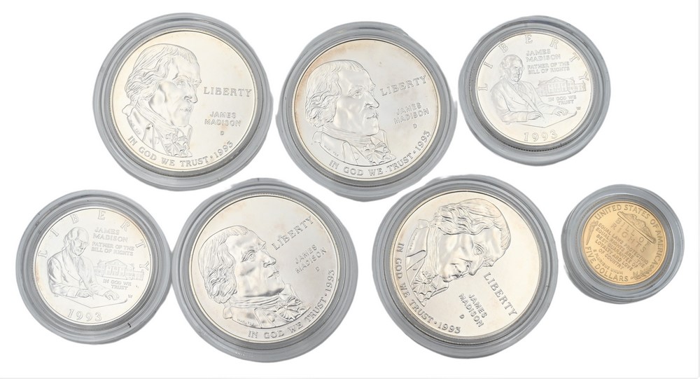 Seven Piece Coin Lot, to include one 5 dollar gold uncirculated, along with four 1993 Madison silver dollars, uncirculated, and two silver half-dollars.