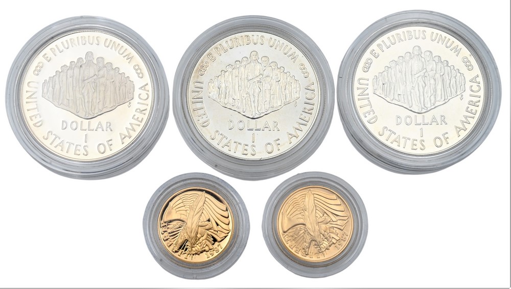 Five Piece 1987 Constitution Set, to include two 5 dollar uncirculated and proof gold, two uncirculated silver dollars, along with one proof silver dollar.