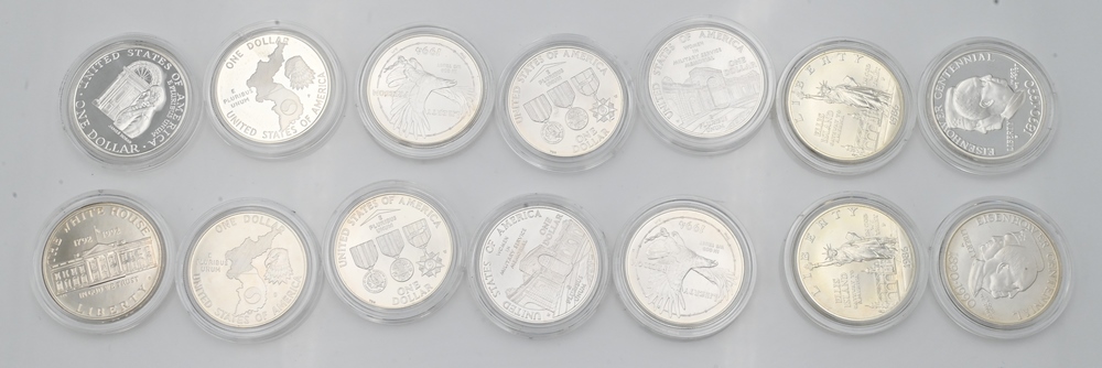 Lot of 14 Coins, to include 2 uncirculated 1986 Statue of Liberty silver dollars; 1990 Eisenhower dollars, 1 proof, one uncirculated; 1991 Korean War dollars, 1 uncirculated, 1 proof; 2 1992 White House dollars, 1 uncirculated, 1 proof; along with uncirculated 1994 Vietnam Veterans Memorial dollars, Women in Military Service and National POW Museum.
