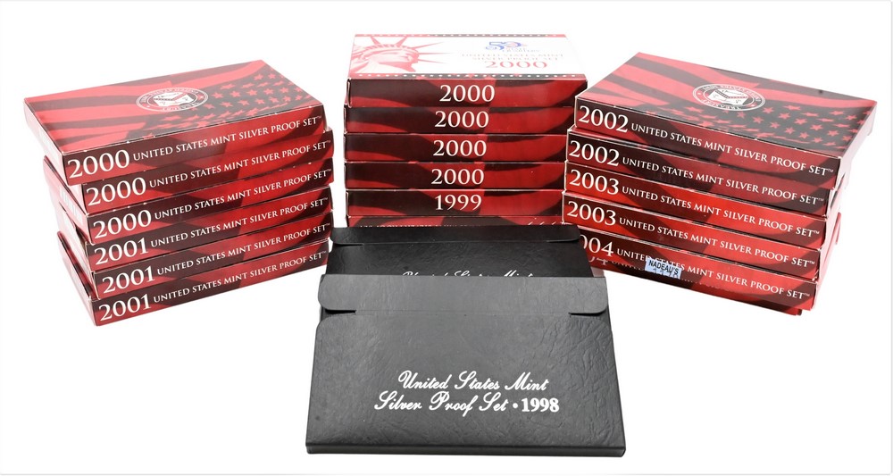 22 Silver Sets, to include four 1998 US silver proof sets (black); two 1999 US silver proof sets (red); seven 2000 US silver proof sets (red); three 2001 US silver proof sets (red); two 2002 US silver proof sets (red); two 2003 US silver proof sets (red); along with two 2004 US silver proof sets (red).