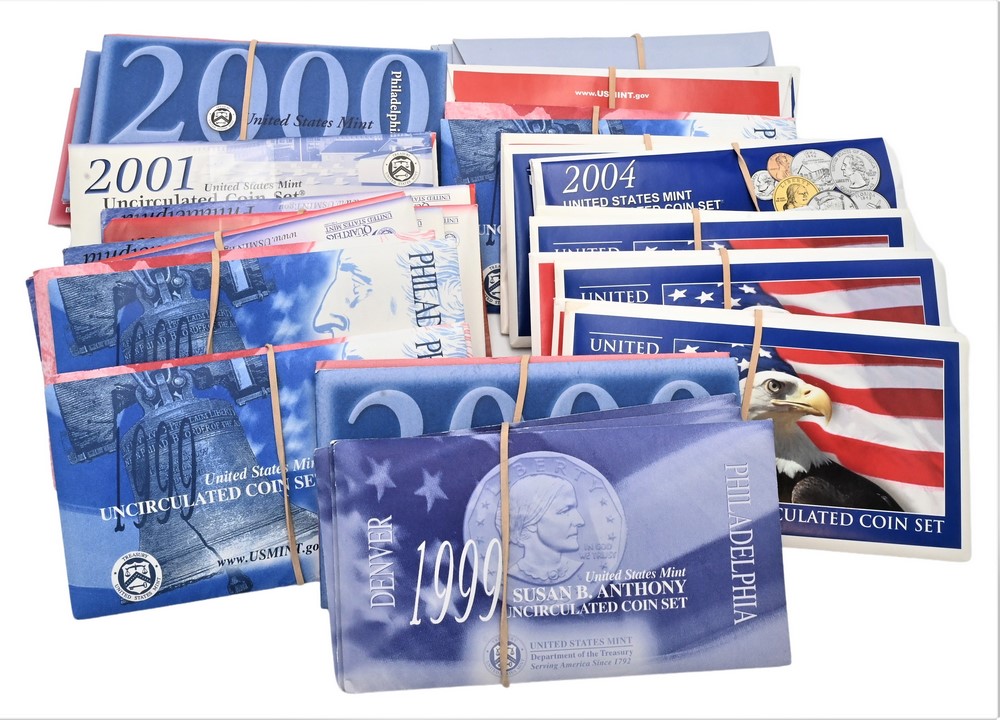 25 US Mint Sets, to include four 1999 P & D uncirculated Susan B. Anthony; four 1998 uncirculated; three 1999 uncirculated; four 2000 uncirculated; four 2001 uncirculated; four 2003 uncirculated; two 2004 uncirculated.