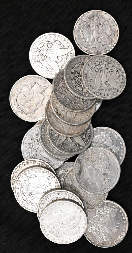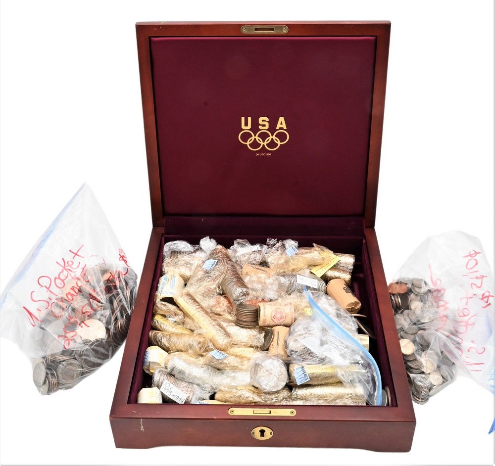 Large Lot of Coins, to include 22 uncirculated rolls of Sacagawea $1 coins, $550 face value; 3 rolls of Ike dollars; along with 1 roll of Kennedy 1974; total face value $620.