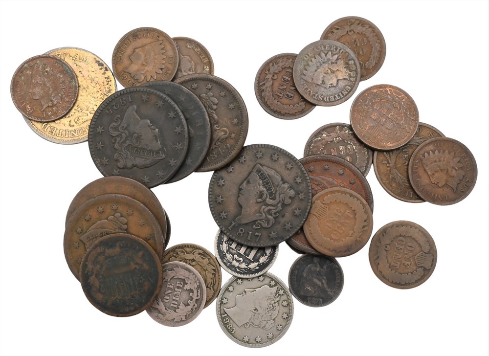 28 Piece Lot of US Coins, to include seven large cents, thirteen Indian head cents, one flying eagle cent, two two cents, nickel three cent, Barber five cent, one dime, one half dime, along with one 1806 quarter.