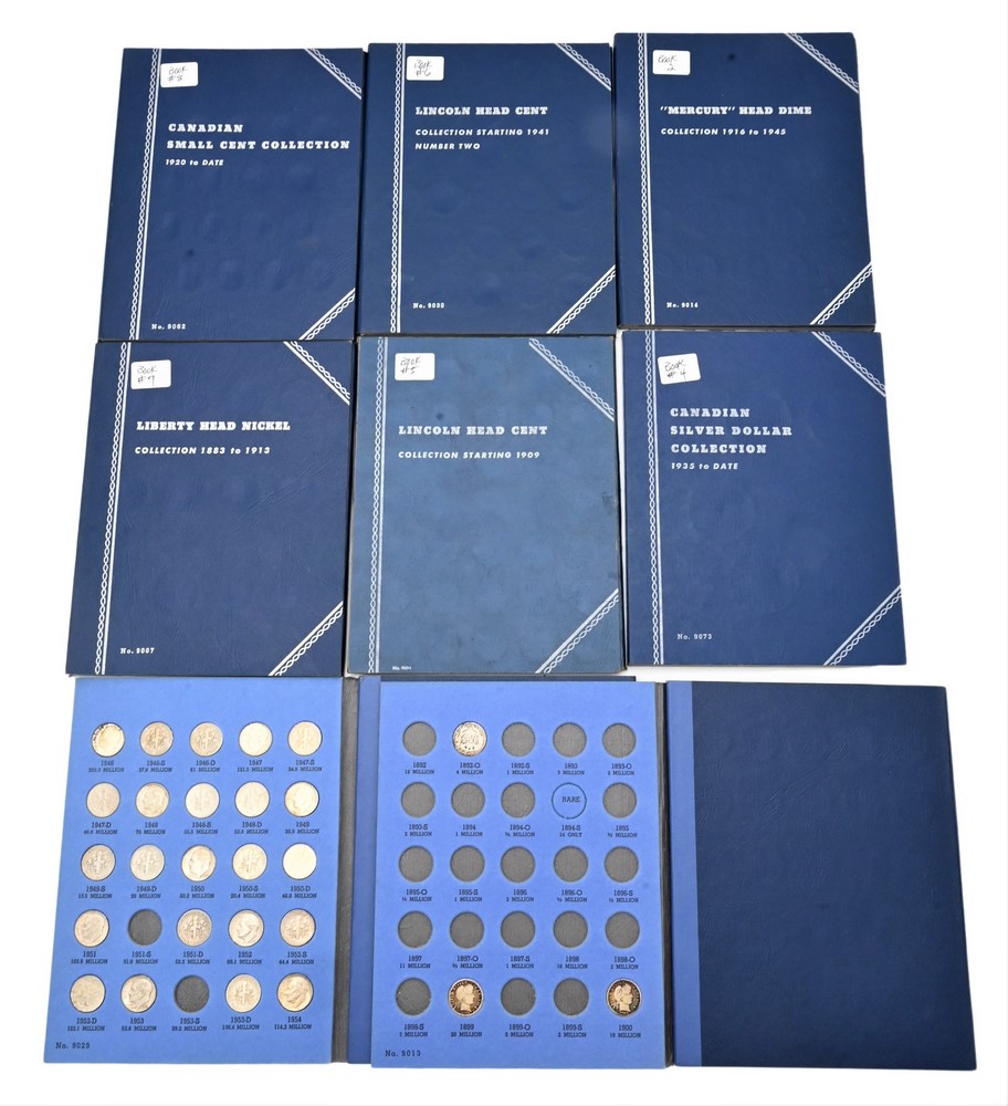 Large Lot of Coins, to include blue folder of Roosevelt dimes; blue folder of Mercury dimes; blue folder of very worn Barber dimes; blue folder of Canadian silver dollars to include one 1935, one 1936, one 1938, and 10 common dates; blue folder of 90 Lincoln one cents, 1909 VDB; blue folder of Lincoln one cents, 51 wheats, 8 memorials; blue folder of 17 Liberty Head V, and one 1883 no cent; along with a blue folder of 34 Canadian small cents.