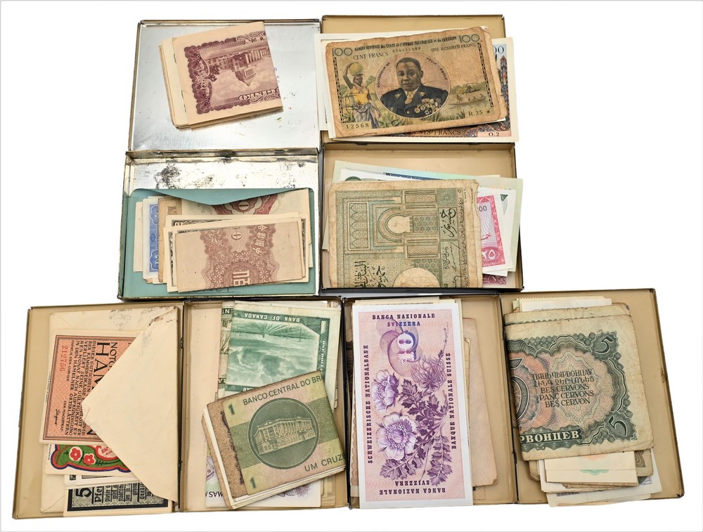 Large Lot of Currency, to include US small paper currency to include Friedberg 1500 three US one dollar notes, Woods and Woodin red seal “funny” back, series of 1928 “raggy”, G-VG, VG, and Fine; two 1928 one dollar silver certificates 17’s, one rag and one VG; three series of 1934 one dollar silver certificates Julian Morgenthau; Friedberg 1602 series 1928B one dollar silver certificate Woods and Mills; Friedberg 2300 series 1935A one dollar silver certificate World War II emergency issue yellow seal; six two dollar US notes to include Friedberg 1505 1928 – D, Friedberg 1506 1928 – E; Friedberg 1507 1928 – F, Friedberg 1508 1928 – G. Friedberg 1509 1953; Friedberg 1511 1953 – B; two 5 dollars silver certificates to include series of 1929 Federal Reserve of New York 1850 – B, fine; along with series of 1934 – A Friedberg 2302 silver certificate no. Africa yellow seal.