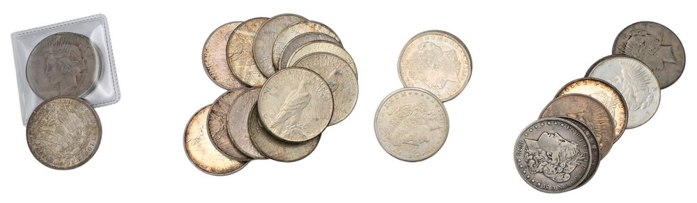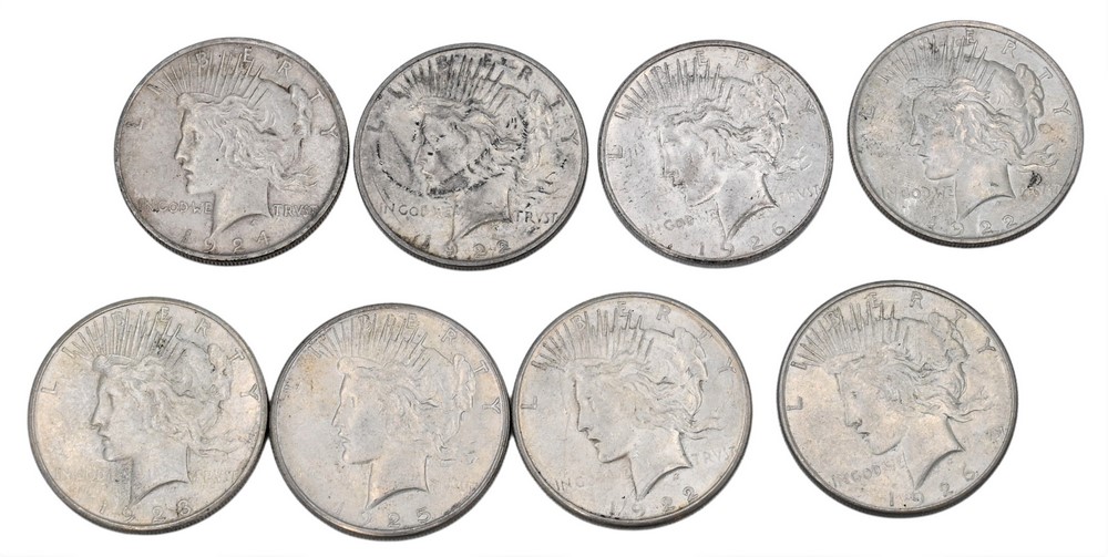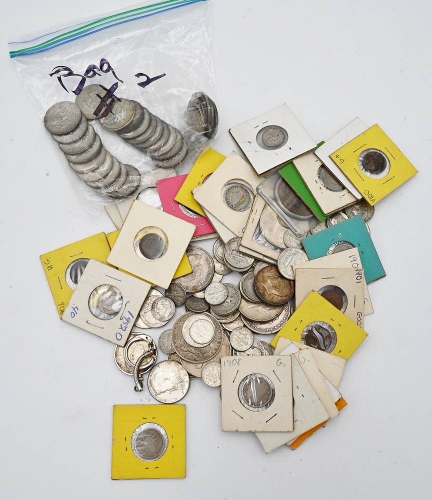 Large Lot of Coins, lot of eight silver dollars, one Canadian, 8 silver half dollars, 26 Kennedy clads, 1 Booker T. Washington, 1 Israh coin, 23 silver quarters, 1962 D once cent uncirculated dimes and nickels, along with Indian head pennies.