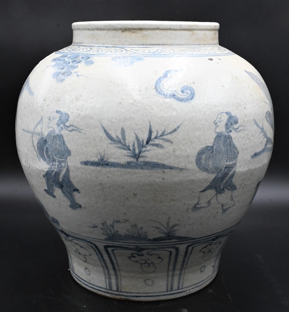 16 Piece Group, to include seven figural Staffordshire pieces, along with six blue and white historical Staffordshire pieces, to include Clews, Lafayette, Wood and Sons, Troy Steam Ship, American Ship, and Castle Garden New York Platter.