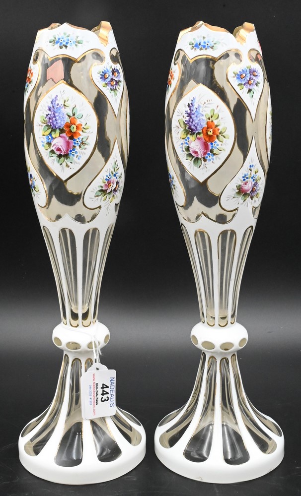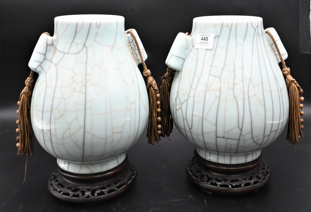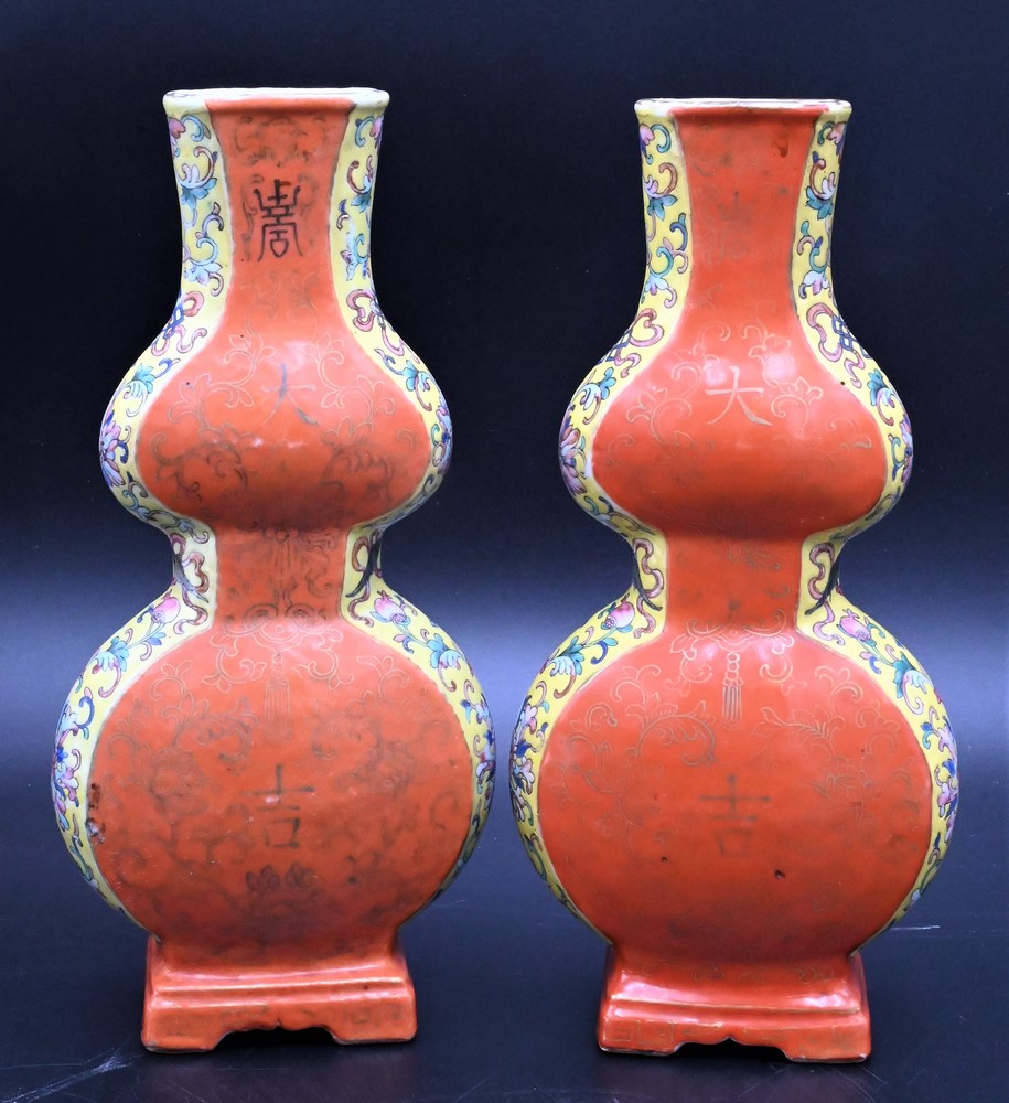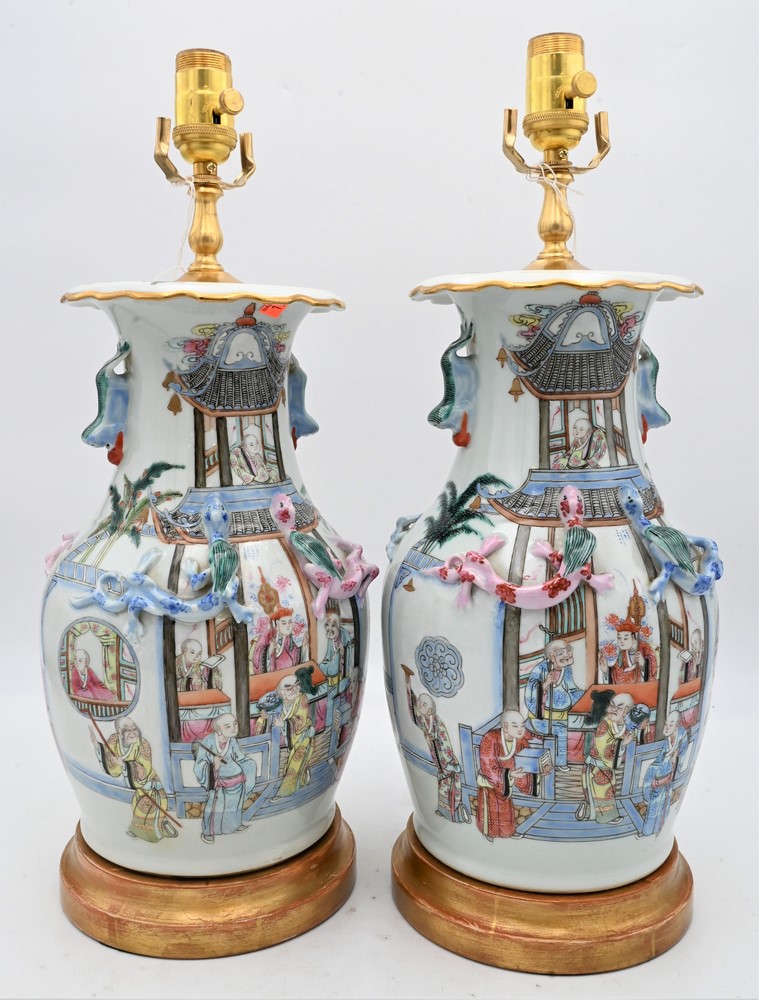 Pair of Chinese Famille Rose Porcelain Vases, made into table lamps, having moulded dragon and foo dog handles, painted courtyard scene with scholars, height 21 inches.
