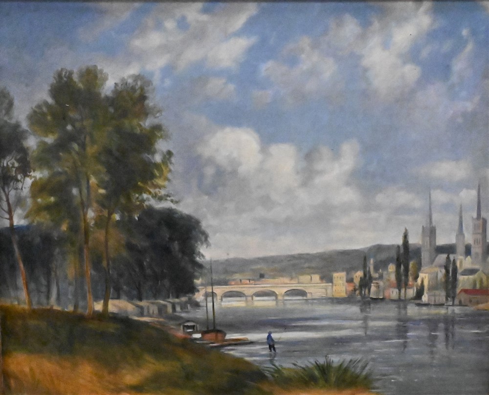 Two Landscape Oils on Board, to include a shoreline scene with fisherman, signed and dated “Edechamp 1898″ lower left, 15 3/4″ x 19″; along with a sunset scene, signed indistinctly lower left, 13 1/2″ x 17 1/2”.