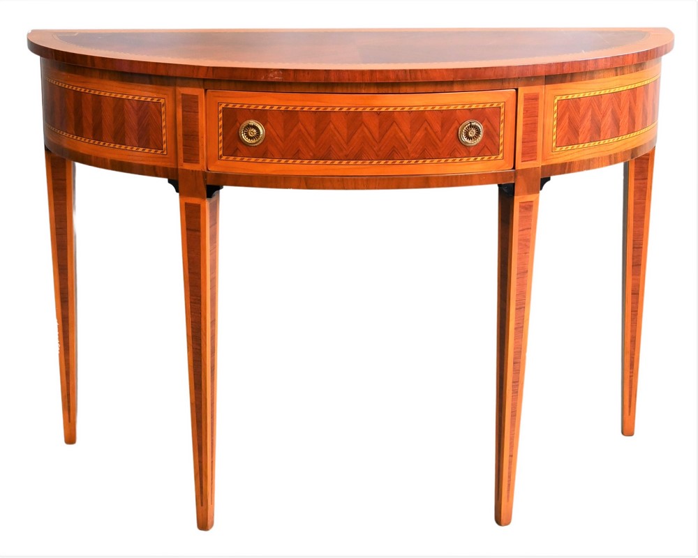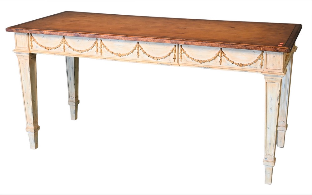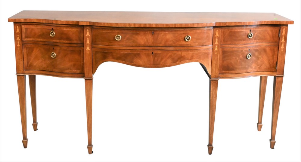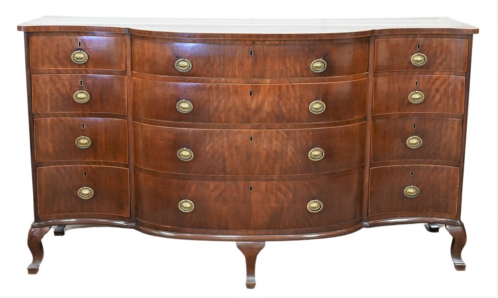 Mahogany Credenza, having four bowed center drawers flanked by four concave drawers on either side, on scrolled feet, late 19th/early 20th century, height 39 inches, top 23″ x 69 1/2″.