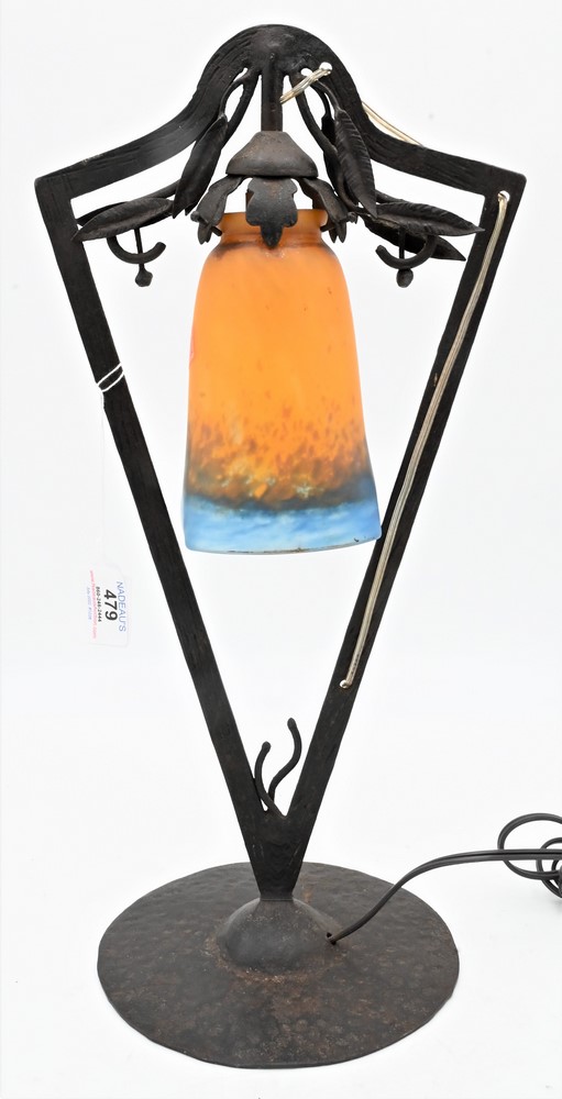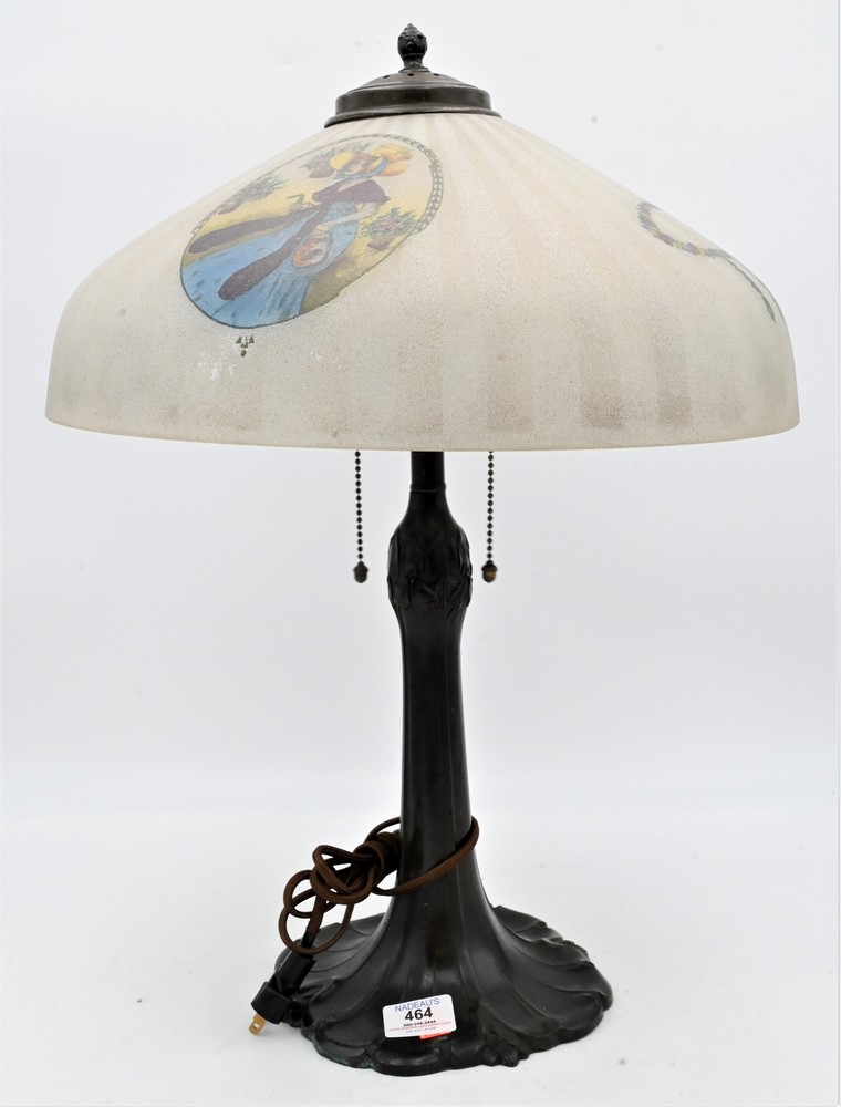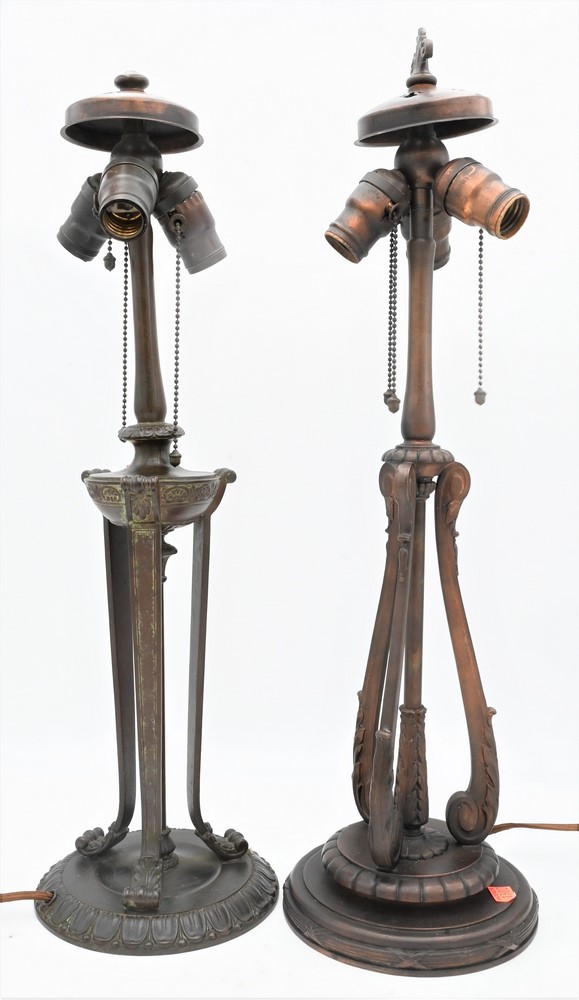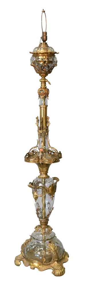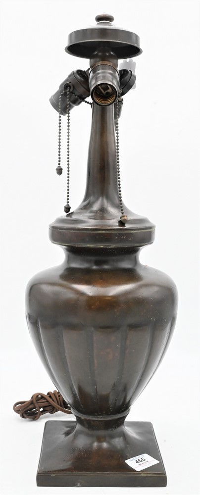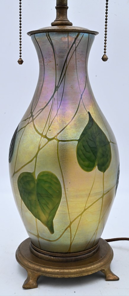 Tiffany Studios Bronze and Art Glass Table Lamp, having favrile art glass vase with moulded leaf decoration on bronze base, marked Louis C Tiffany Furnaces, Inc. on bottom, height 24 inches.