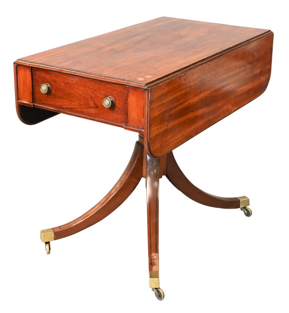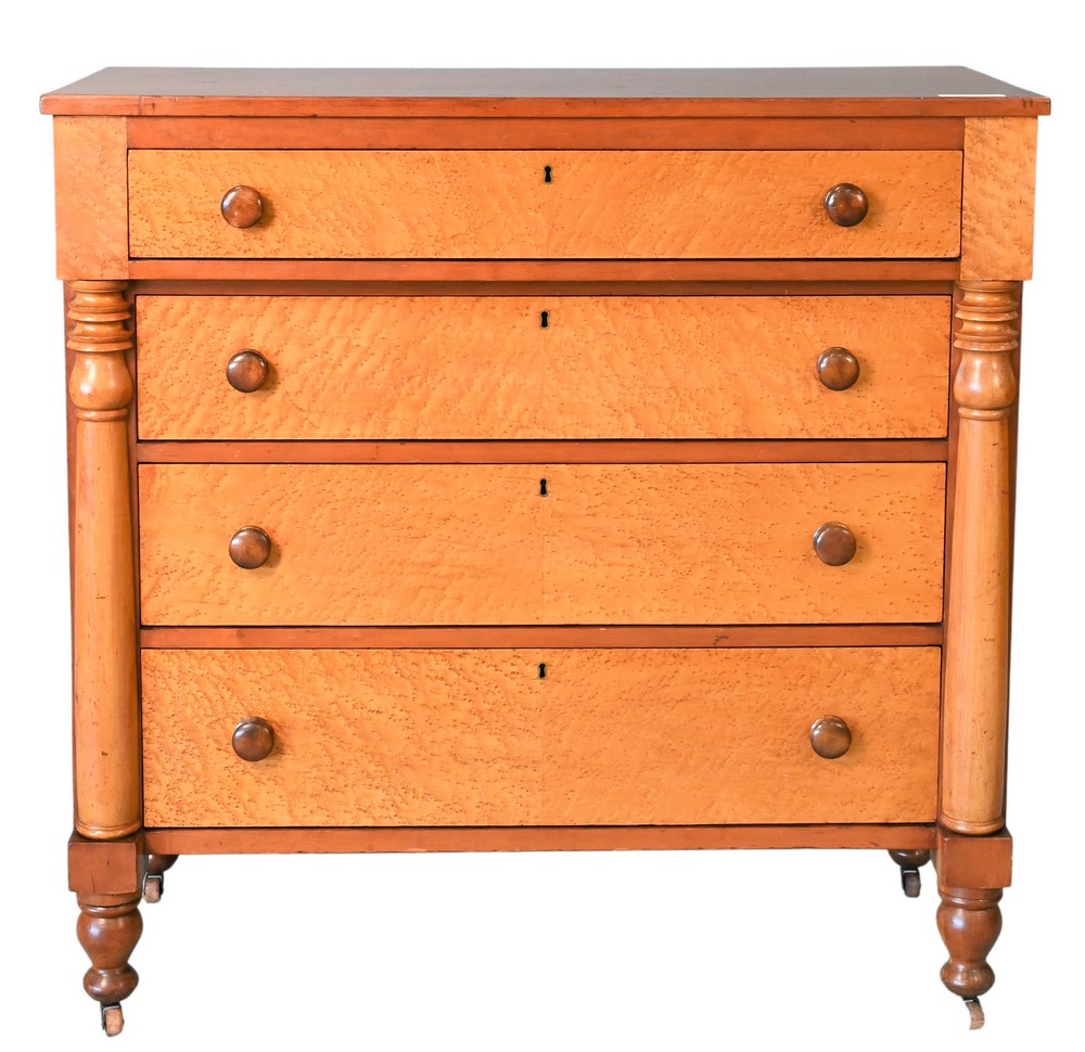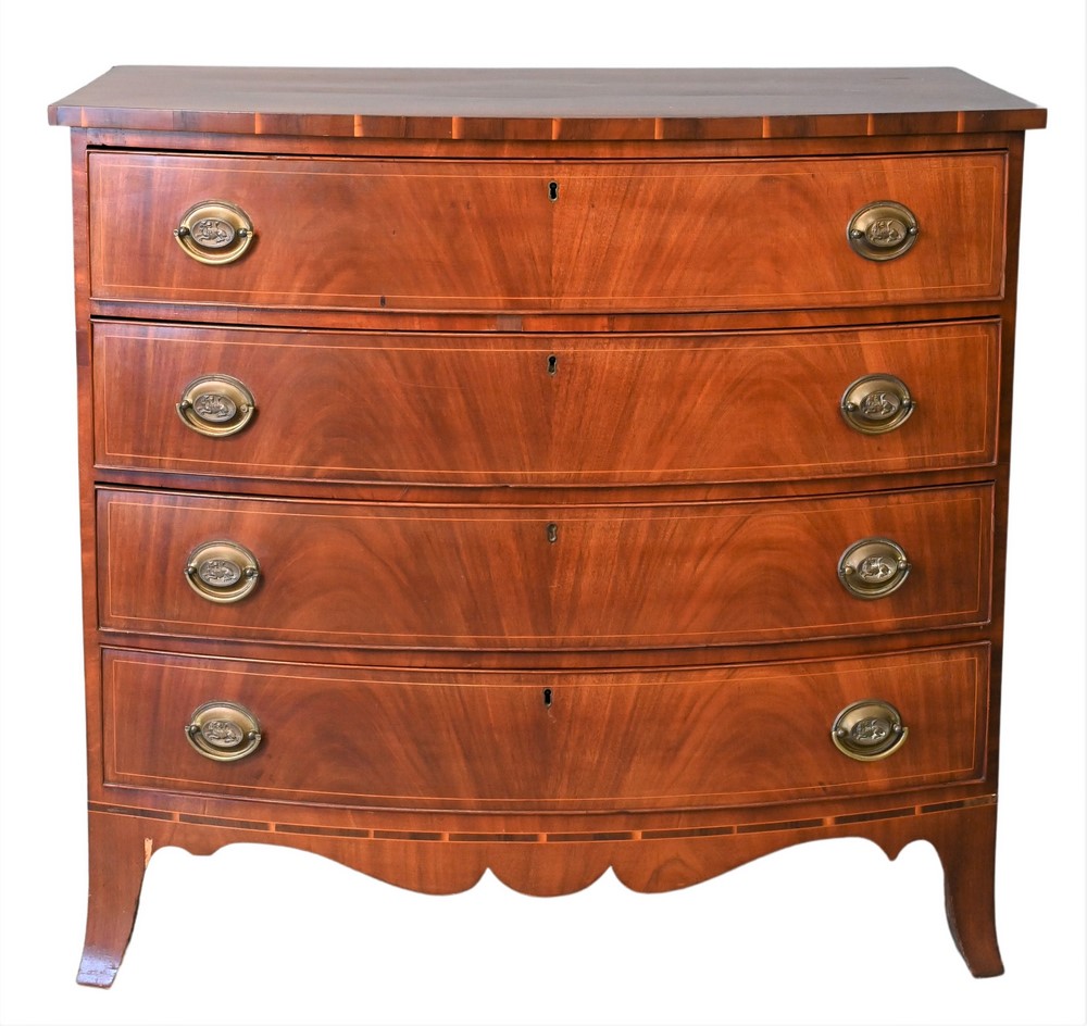 Mahogany Bow Front Four Drawer Chest, on French feet with line inlay, circa 1800, one brass bail missing, small cracks in top, height 36 1/2 inches, width 37 3/4 inches, top 21 1/2″ x 39″.