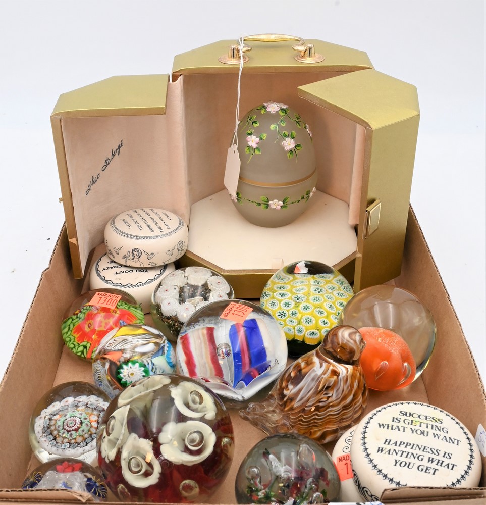 17 Piece Lot, to include a Faberge egg, glass with enameled flowers in fitted case; along with 16 art glass paperweights.