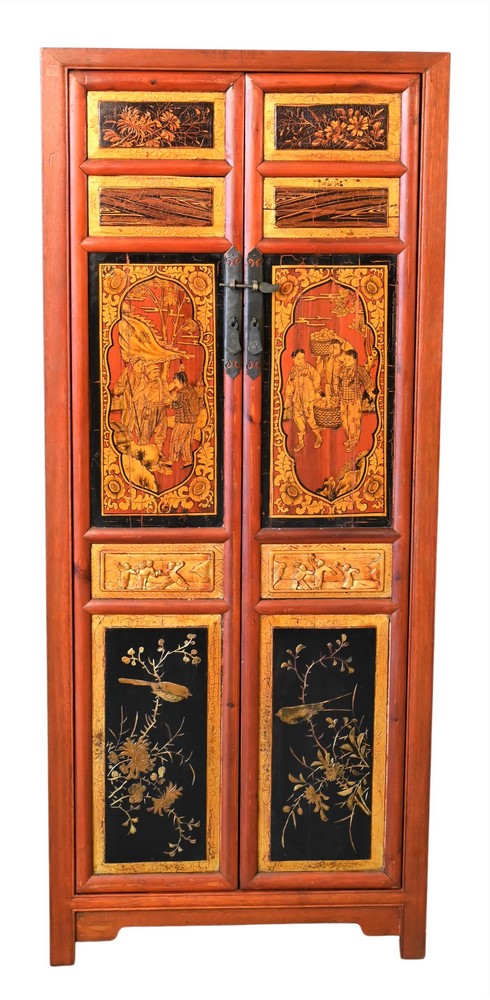 Two Door Oriental Style Cabinet, having shelves and drawers in slide, top 16″ x 26″.