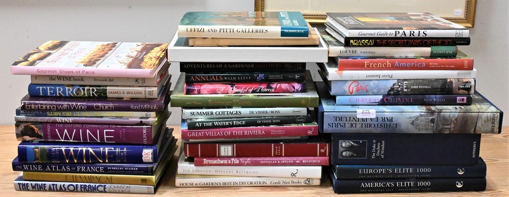Approximately 47 Various Coffee Table Books, topics include wine, France, antiques, along with home decor.