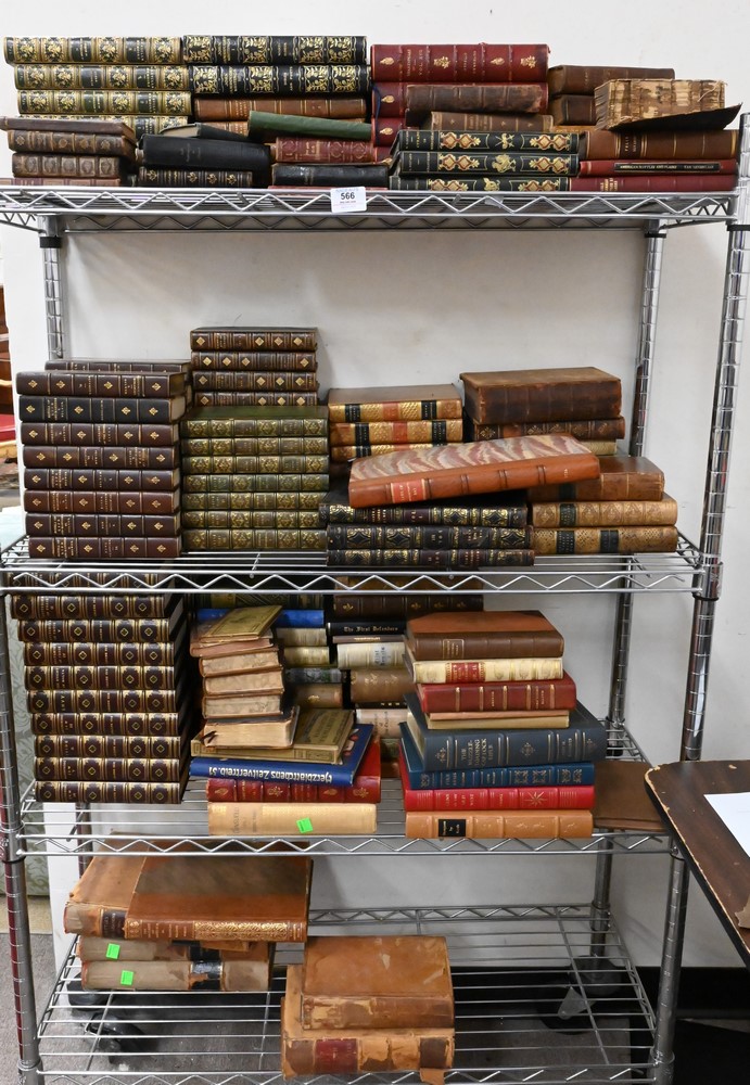 Large Group of Leather Bound Books, some sets, topics include Irish Tales, Mysteries of Paris, Master Humphrey’s Clock, along with 17th, 18th and 19th century.