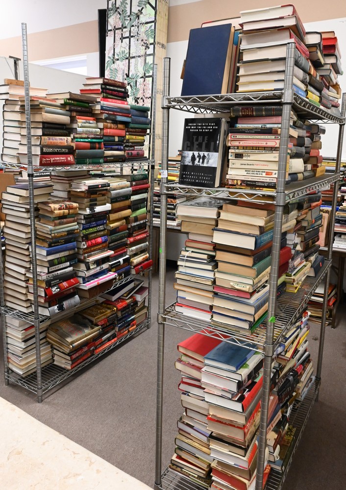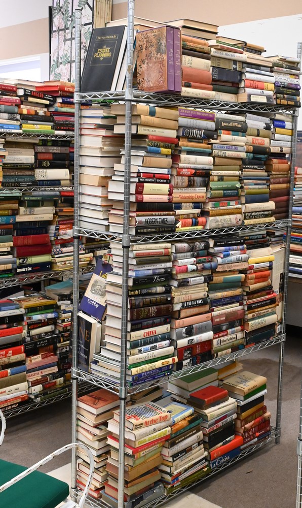 Three Racks of Books, topics include WWII, history, law transcripts, along with fiction and nonfiction.