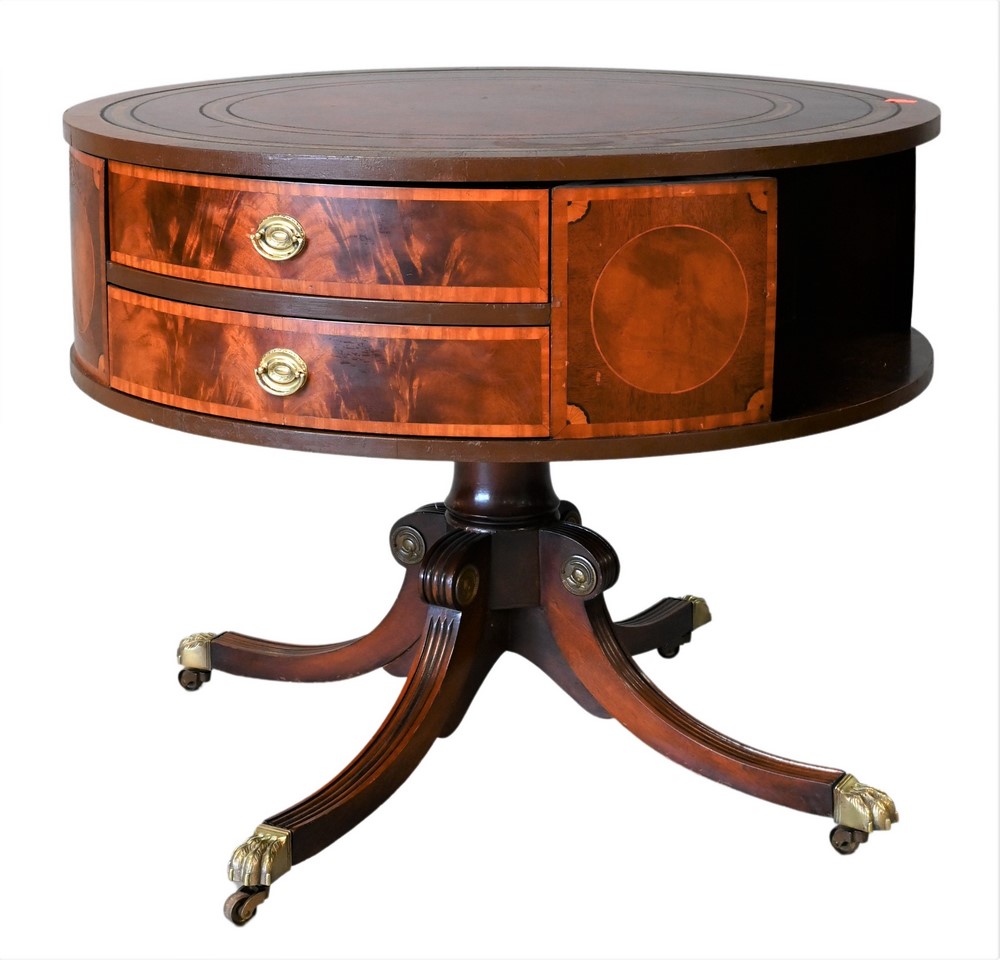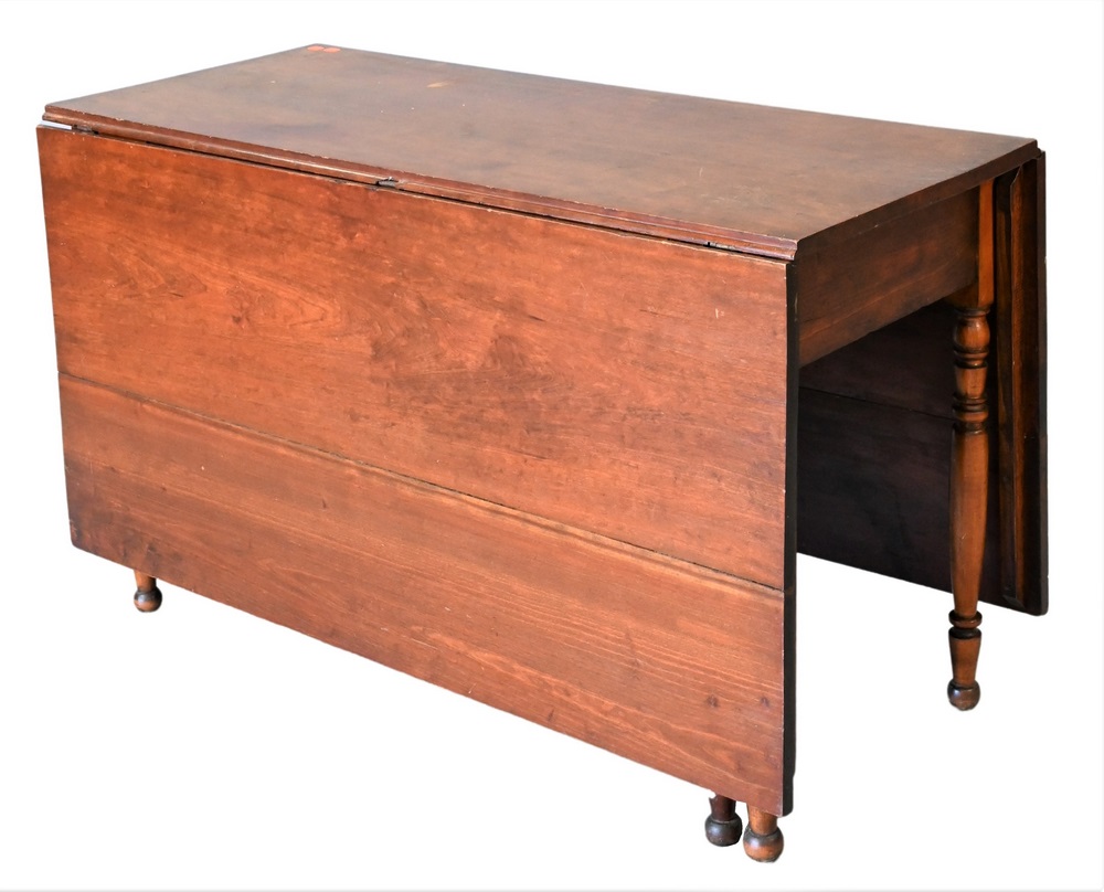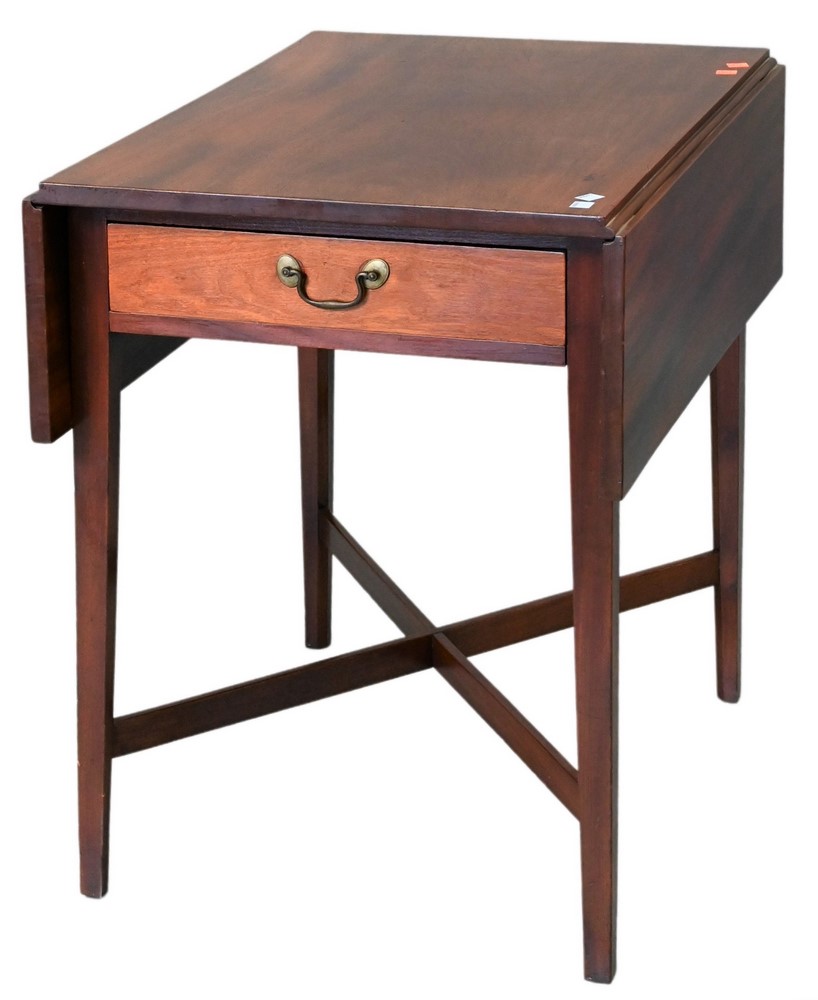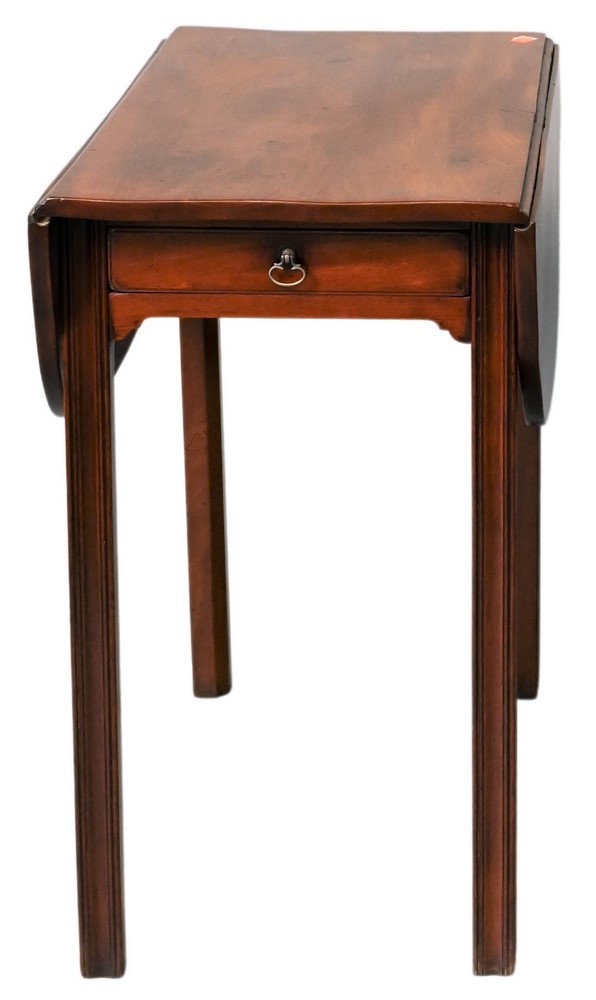 Chippendale Mahogany Drop Leaf Pembroke Table, having drawer, on molded square legs, England circa 1780, height 27 3/8 inches, depth 28 1/2 inches, top closed 16″ x 28 1/2″.