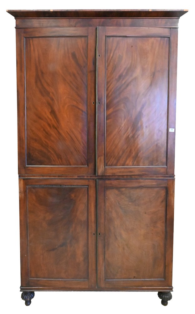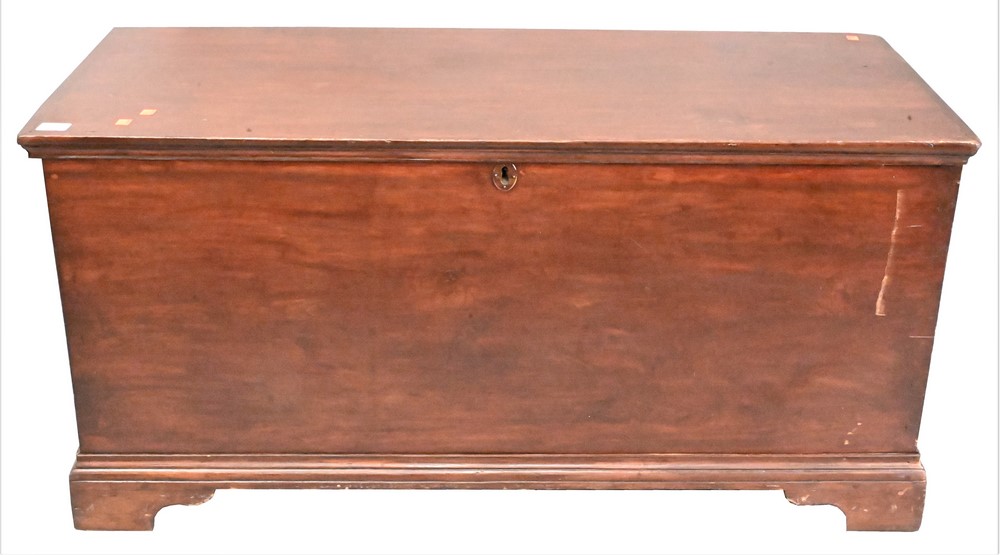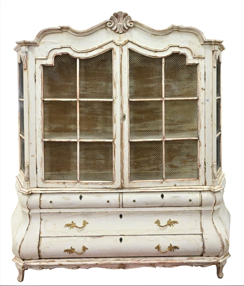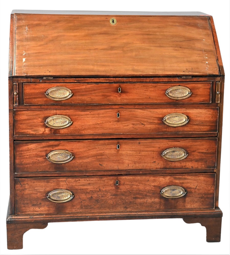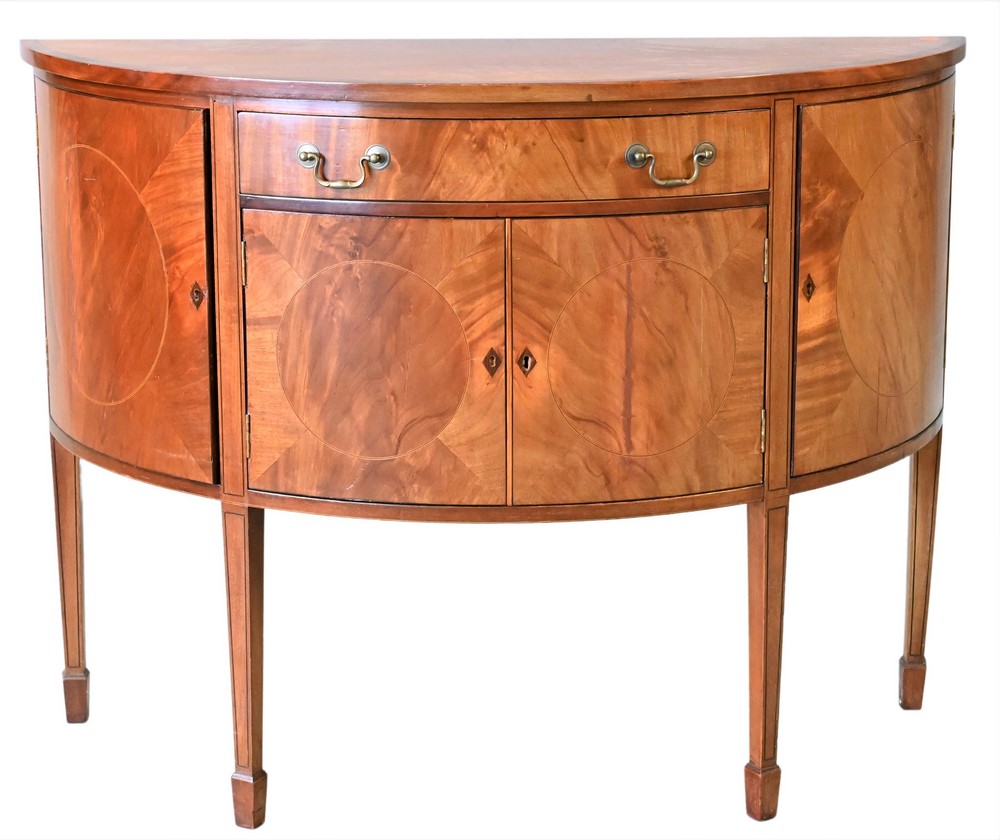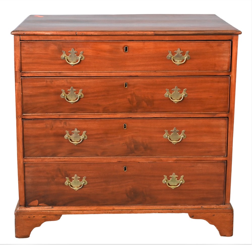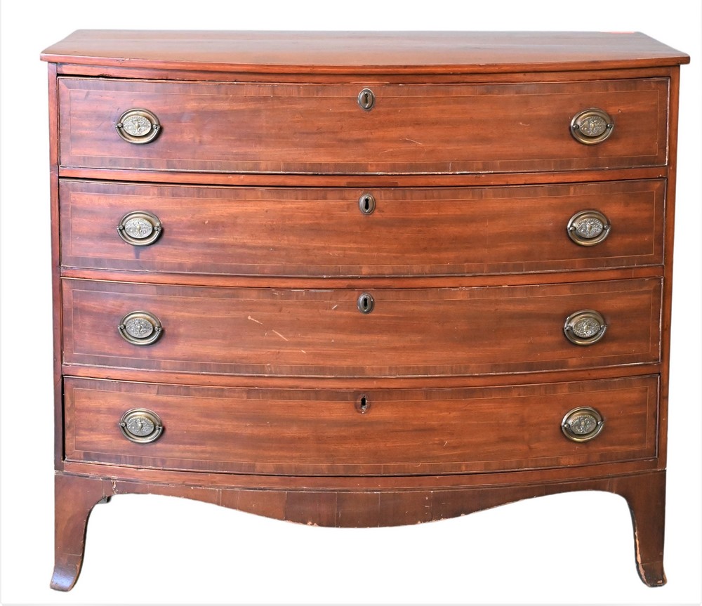 Federal Cherry and Mahogany Bowed Front Chest, having banded inlaid drawer front and eagle pulls all set on french feet, circa 1800, height 35 1/4 inches, top 21 1/4″ x 21″.