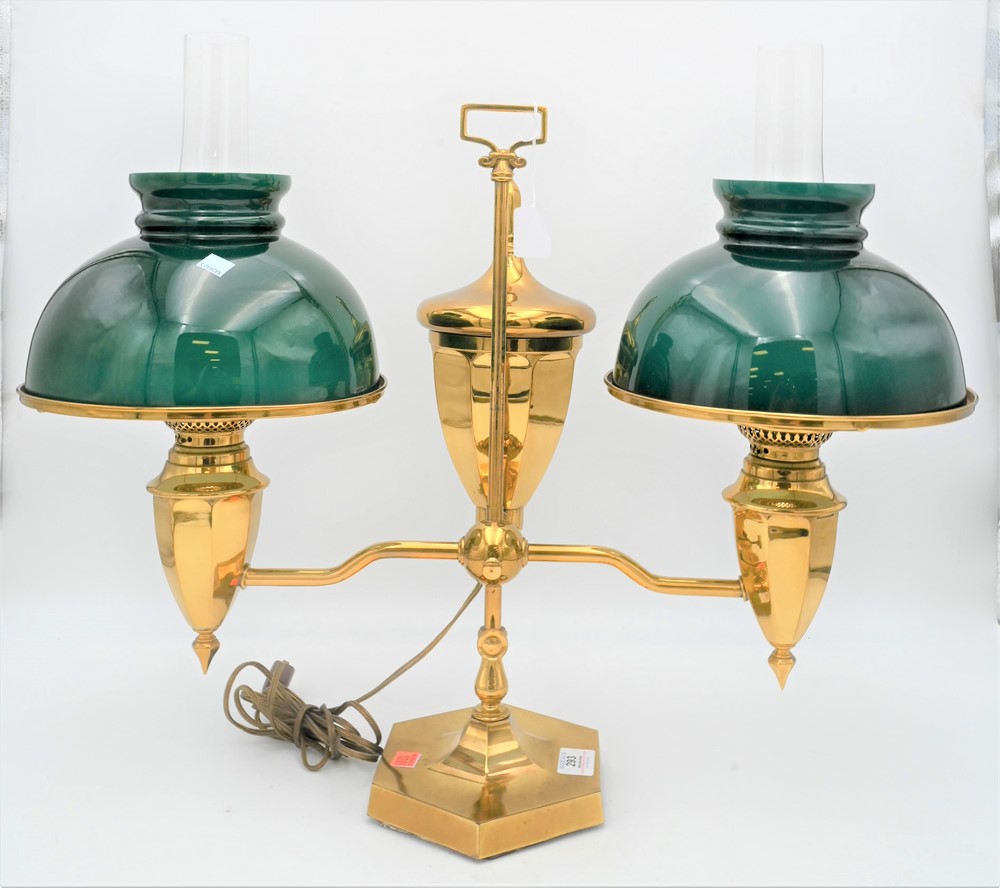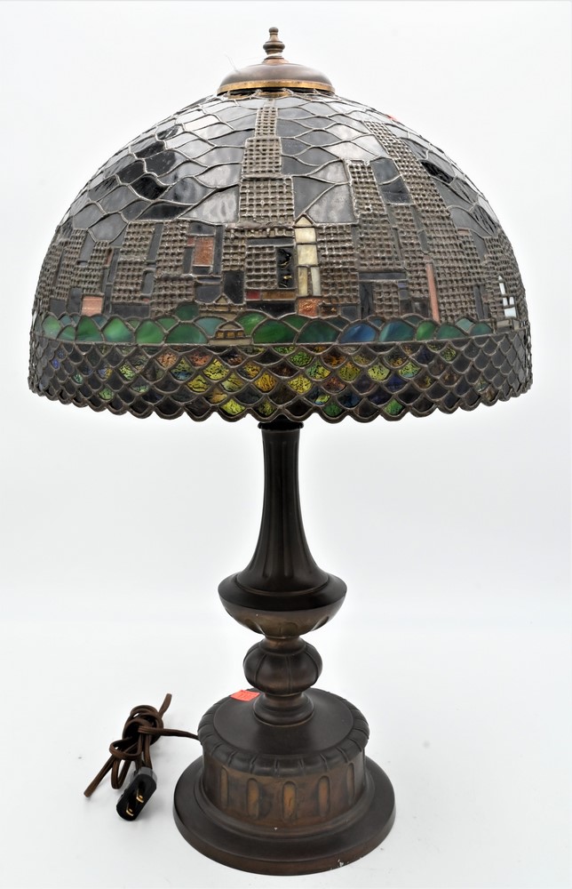 Frank Kucera Leaded Glass Table Lamp, having shade depicting Chicago skyline, on metal base with three sockets, shade signed Frank Kucera 1982, diameter 15 inches, height 25 inches.