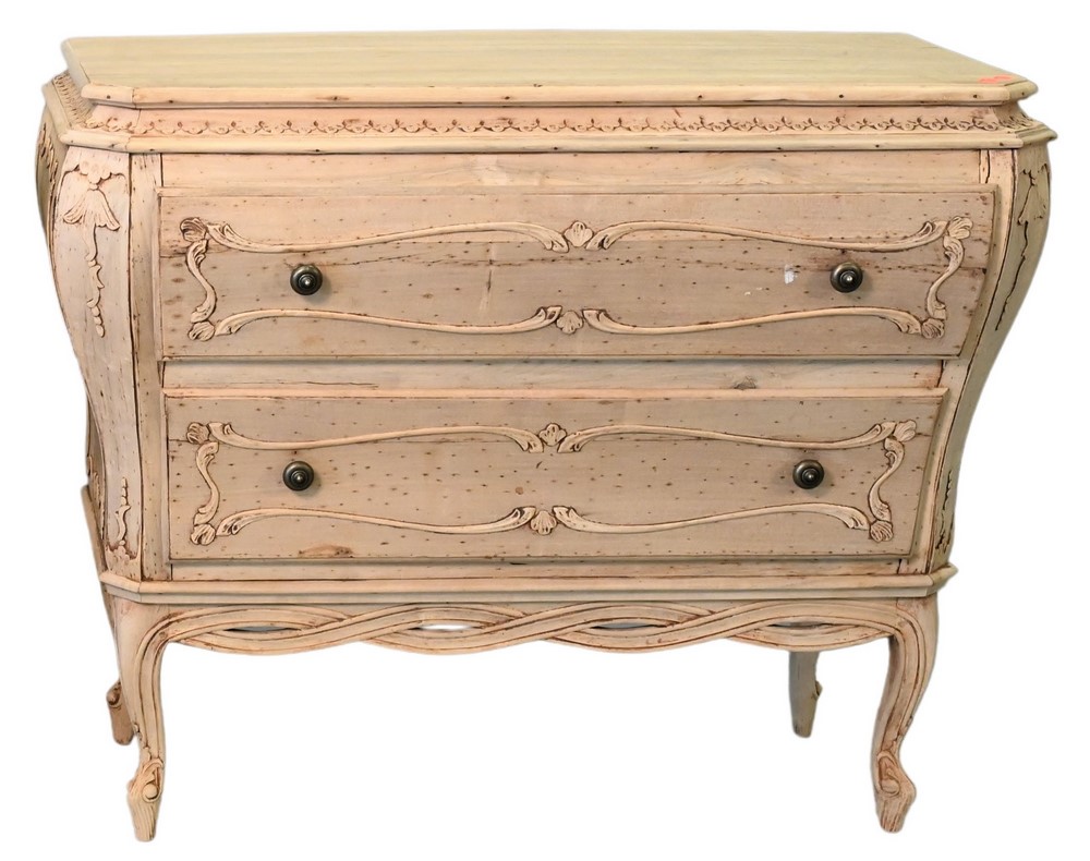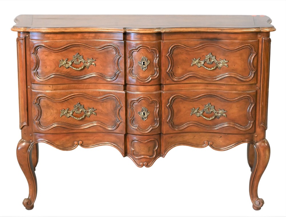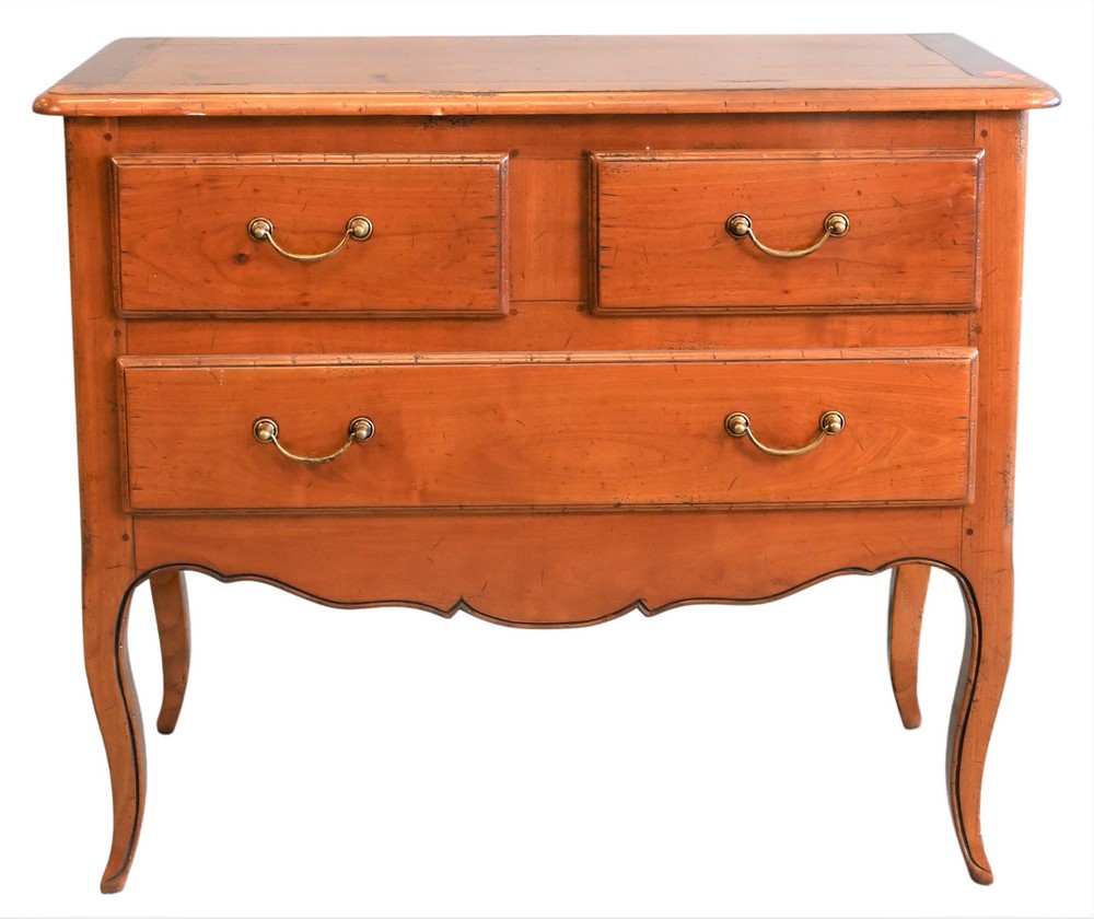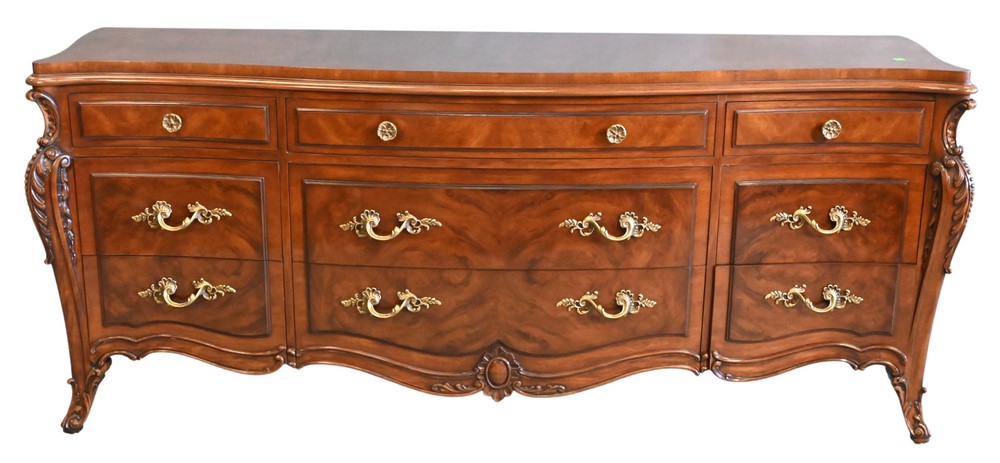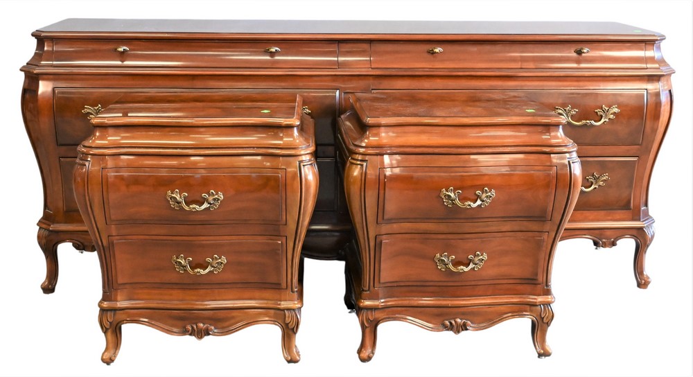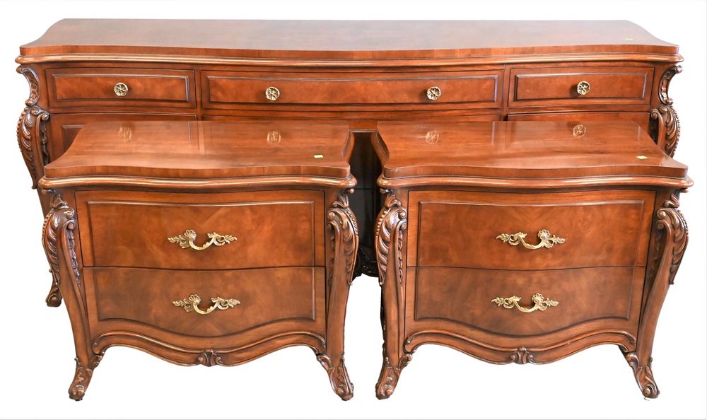 Karges Three Piece Set, to include a double chest, along with two Louis XV style bedside chests having two drawers each; height 33 1/2 inches, top 18″ x 76″.