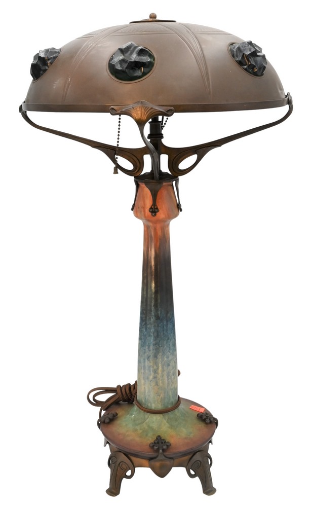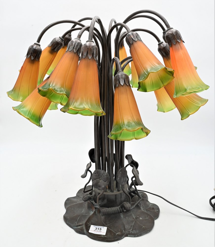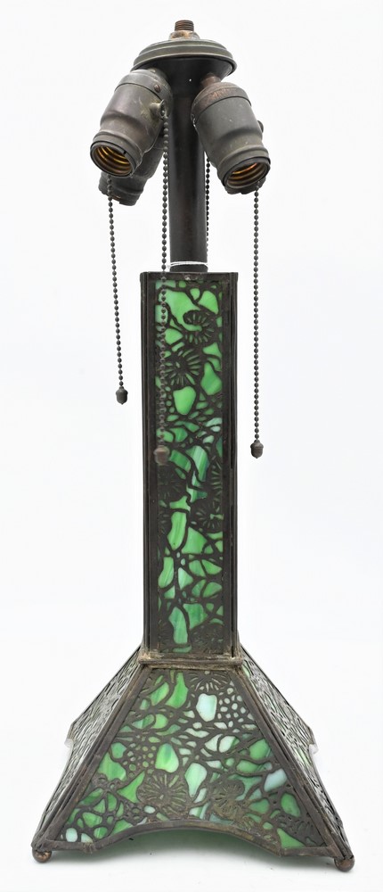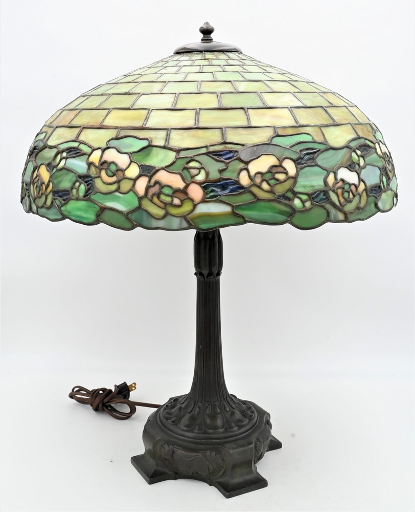 Attributed to Duffner and Kimberly Leaded Glass Table Lamp, having water lily band around bottom edge on bronze base, shade diameter 20 inches, height 25 inches.
