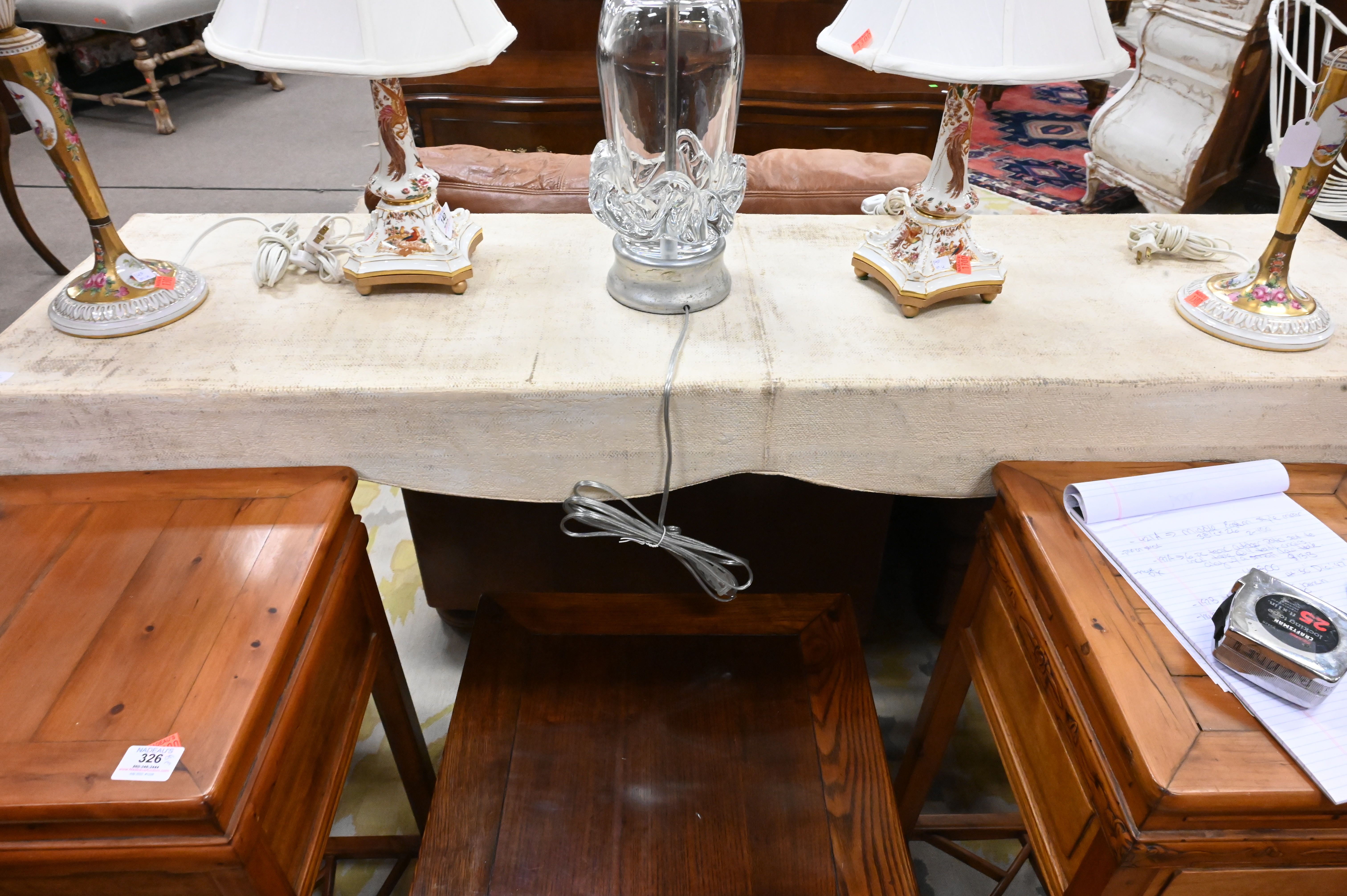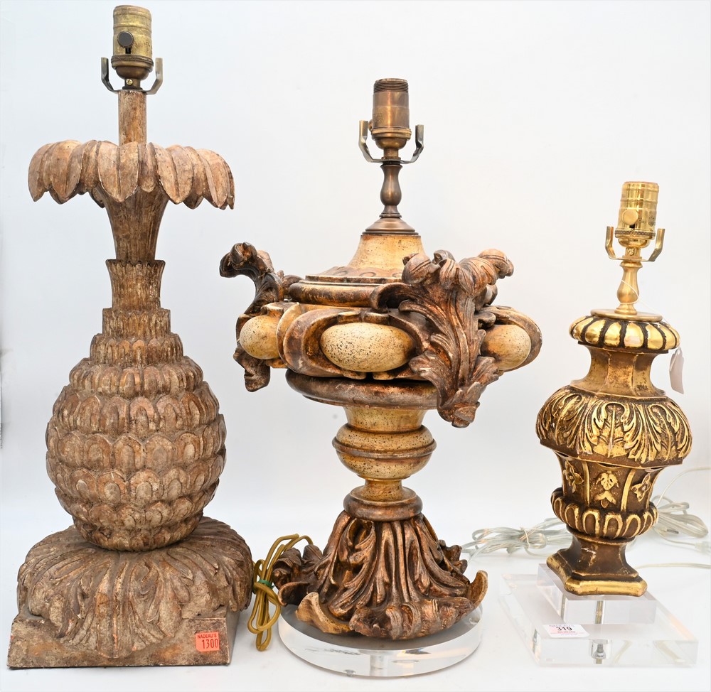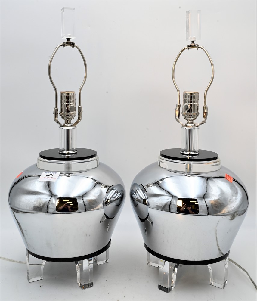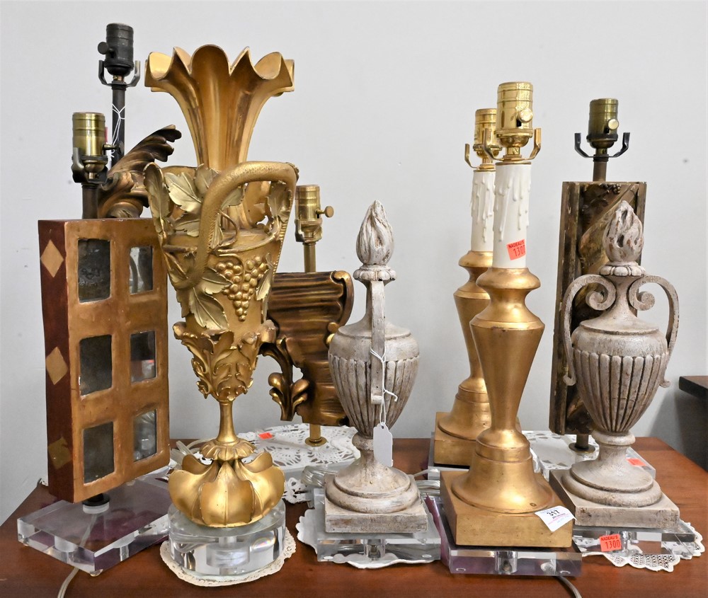 Nine Piece Group of Table Lamps, to include a pair of candlestick lamps, four fragments on lucite bases, along with three urns on lucite bases, tallest 23 inches.