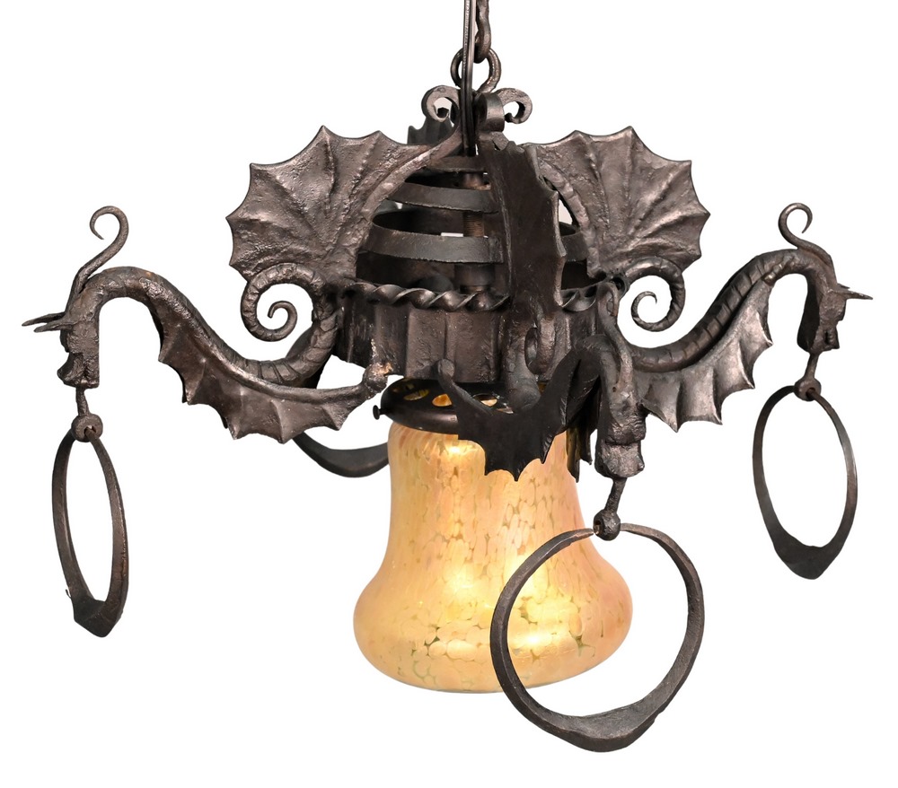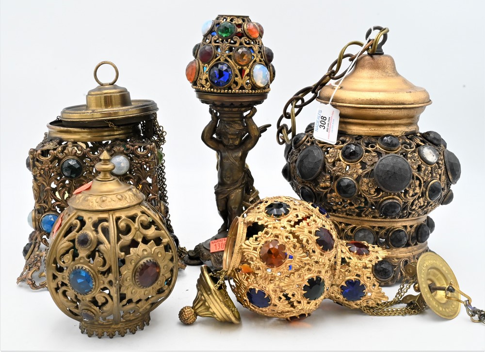 Group of Jeweled Shade Items, to include a figural fairy lamp having jeweled shade, along with four jeweled hanging lights having shades, tallest 10 inches.