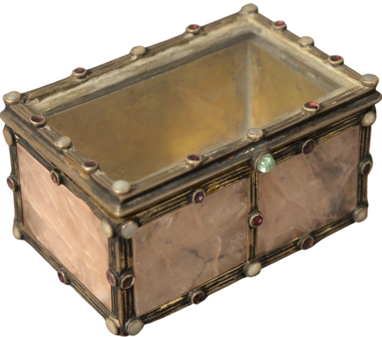 Silver and Jeweled Mounted Stone Box having glass top with stone mounted border opening to gold wash interior, bottom bearing hallmarks, height 2 inches, width 3 1/2 inches, depth 2 inches.