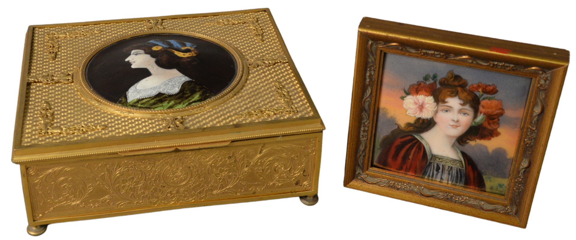 Two Piece Lot to include a French gilt bronze box having mounted and painted porcelain plaque of a woman along with a framed, painted porcelain plaque depicting a woman with flowers in her hair, box height 2 1/2 inches, width 9 inches, depth 7 inches.